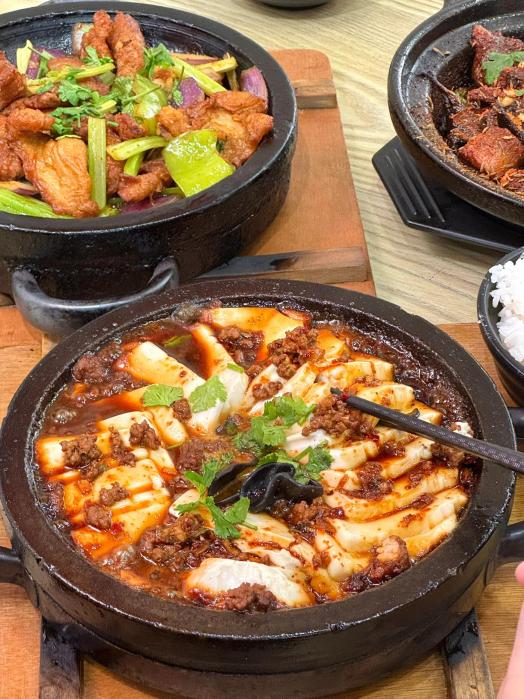 可以看到砂锅菜的制作过程 浇上热油香!!虎皮凤爪锅 虾仁粉丝煲 有一说一入味透了