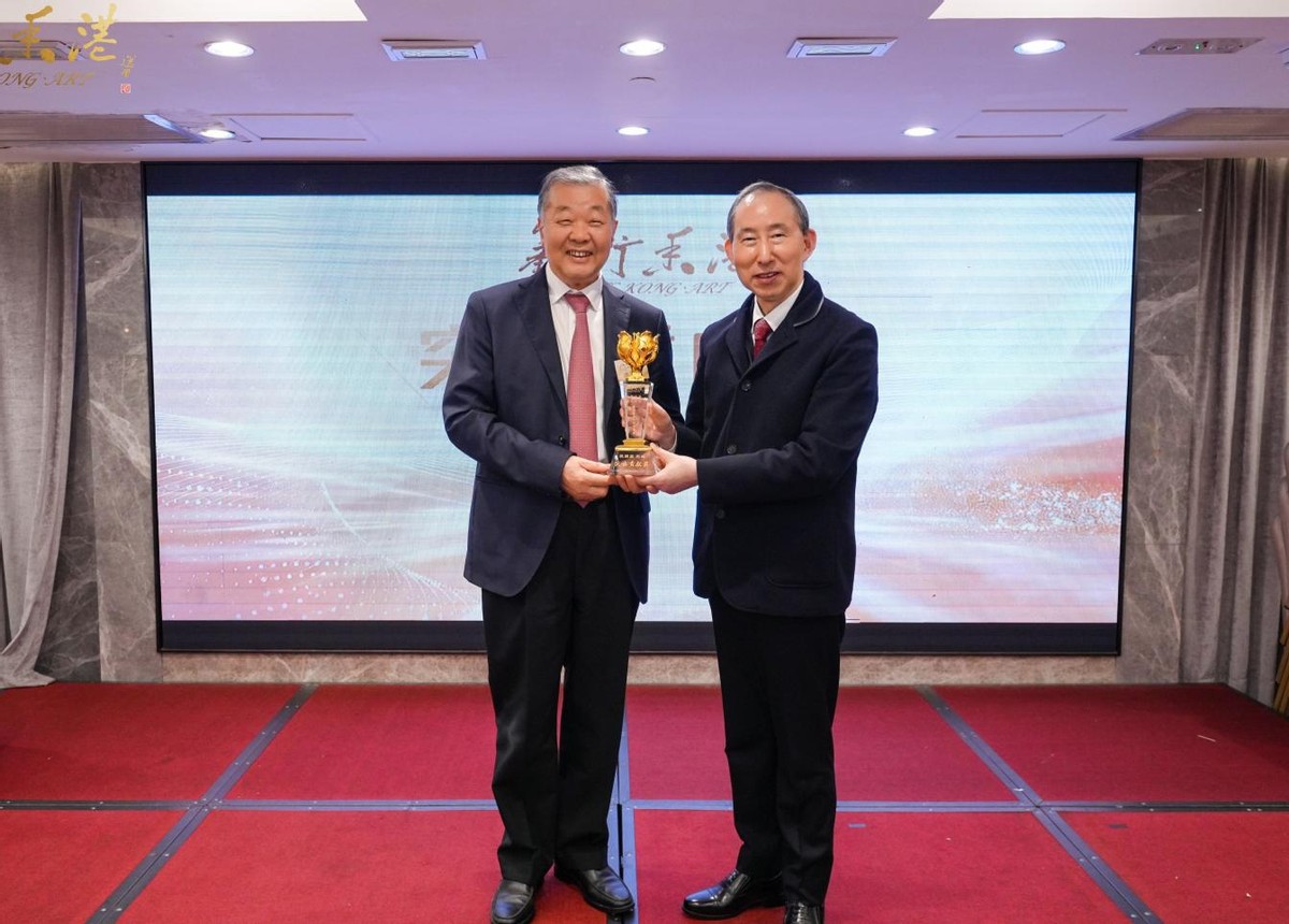 龙宇翔为香港新闻工作者联会会长、艺术香港首席顾问张国良颁发“突出贡献奖”奖杯