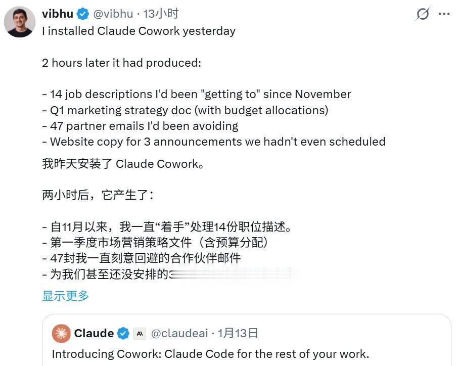 他表示自己安装 Cowork 后,仅用 2 小时就完成了原本需要 2 个月的工作,包括生成职位描述、营销策略文档、合作伙伴邮件、网站文案等。随后,他「惊慌」地发现日程、待办和收件箱都空了,不知道工作该怎么继续,甚至在为下午的经理一对一会议发愁。