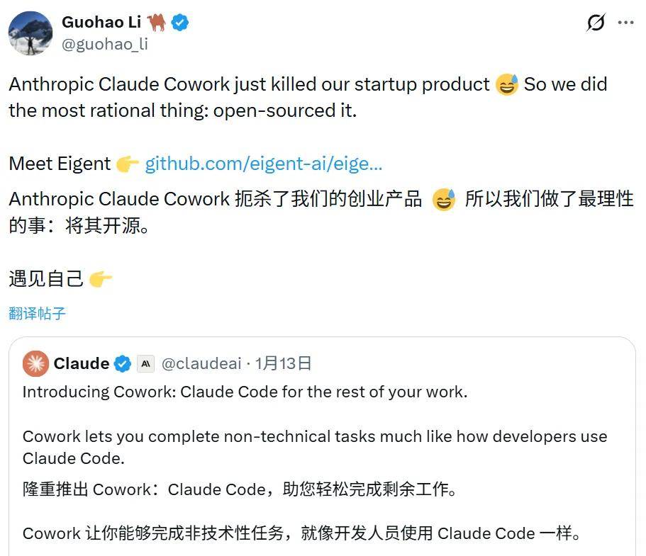 甚至已经有「受害者」出现:用户 Guohao Li 表示,由于 Claude Cowork 的横空出世,他们的类似产品失去了竞争力,于是选择开源。