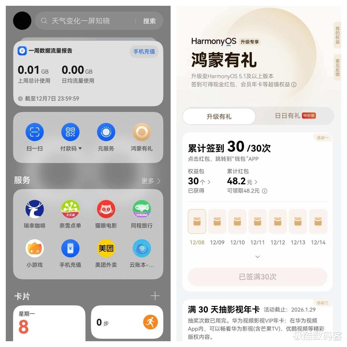 首先,每天点进活动页签到就能领现金红包或者随机权益,我的月卡免单券就是靠这个随机掉落拿到手的权益;另外,在首次签到后第30天起,就可以抽影视年卡,抽中就能在华为视频端内畅看华为影视(含芒果TV)、优酷视频的所有视频,福利再升级。