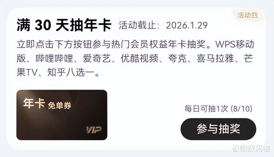 而最让我直拍大腿的是满30天抽年卡活动,只要完成首次签到后的第30天起(注意不需要连续签到哦),就能参与年卡免单券的抽奖,还能从哔哩哔哩、爱奇艺、芒果TV等8大热门应用年卡八选一!相信有不少之前参加过鸿蒙有礼活动的姐妹早就达到参加活动条件,只是后来忙忘了这回事,压根没注意到抽年卡的重磅福利!趁现在还来得及赶紧自查,可别让这泼天的福利白白溜走了!