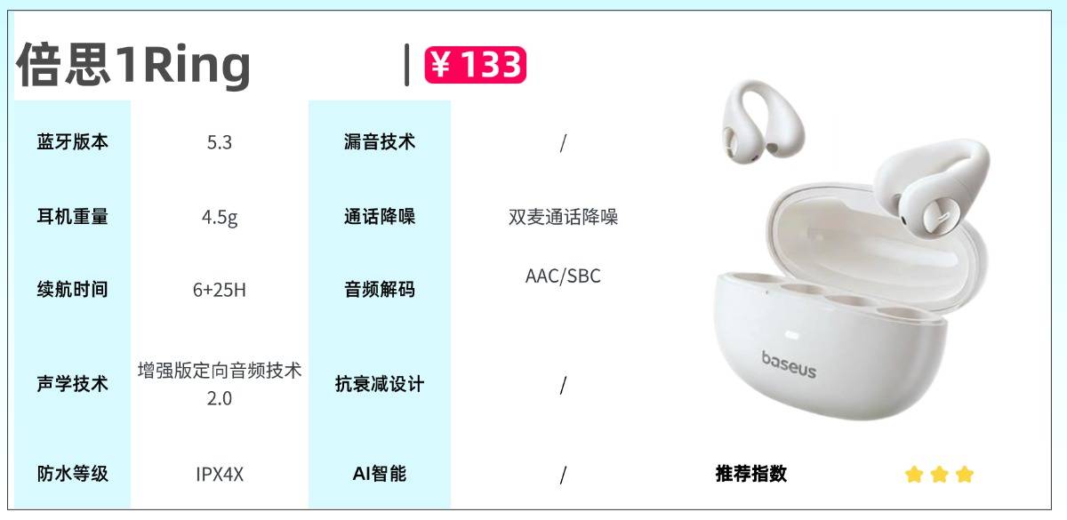 配置方面,选用蓝牙5.3传输方案,连接顺畅且抗干扰表现良好。配合定向传声技术可有效规避声音外泄,双麦克风与AI降噪算法协同运作,使通话过程更为清晰稳定。续航能力也具备不错水准,单次充满可连续播放10小时,配套充电盒能额外延长至40小时总续航,轻松覆盖全天使用需求。此外,IPX4级防水为设备提供了基础抗汗与防雨保障,整体配置均衡、无明显短板。
