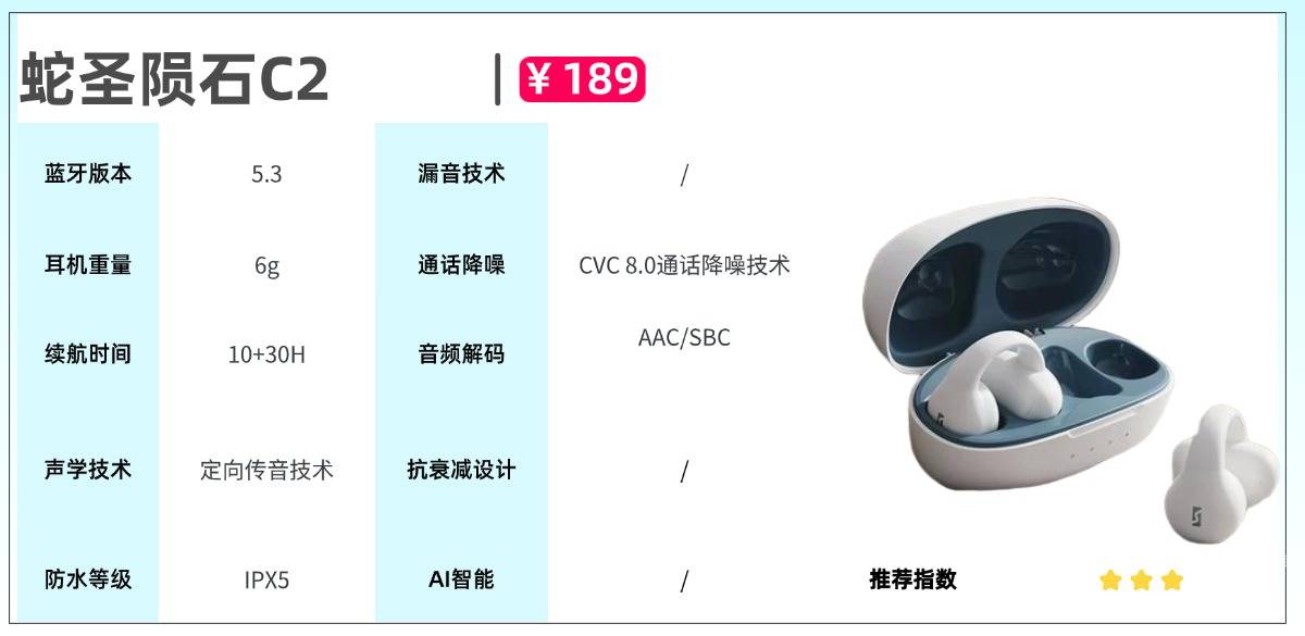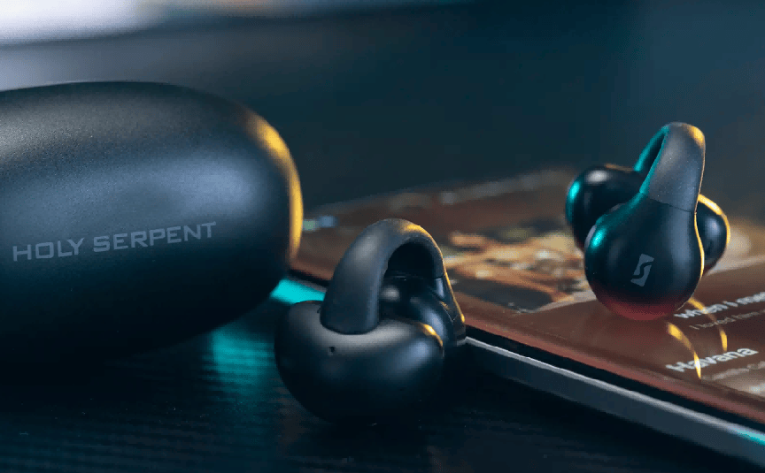 蛇圣C2采用T型360°环绕支撑结构,能够紧密贴合耳廓曲线,即使在跑步、跳跃或快速转头等高强度运动中,依然保持稳固佩戴状态,不易松脱。与耳部接触的区域选用柔滑硅胶材质,触感细腻亲肤;不过由于耳夹腔体设计偏紧凑,耳型偏厚的用户在长时间使用后,可能会感到轻微压迫。