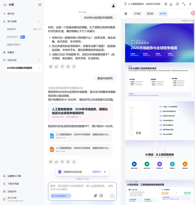比如老板让我分析一下“2026年AI应用的市场趋势”。我直接告诉小艺,TA会像个专业分析师一样,从全网搜索数千个信源,行业权威知识库、和我本机的私有资料中收集数据,生成一份逻辑严密、图文并茂的研究报告,甚至还能导出PPT。我只需要基于它的成果进行决策和润色。原本三天的活,现在半小时搞定,效率直接拉满。