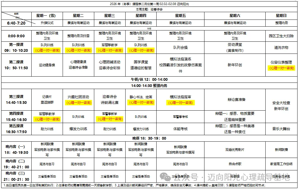 新的一周又开始啦!我们迈向阳光心理疏导基地为青少年们精心准备了丰富多彩的课程,帮助大家在体育锻炼、艺术表达和法律认知中获得全面成长。让我们一起来看看本周的精彩内容吧!