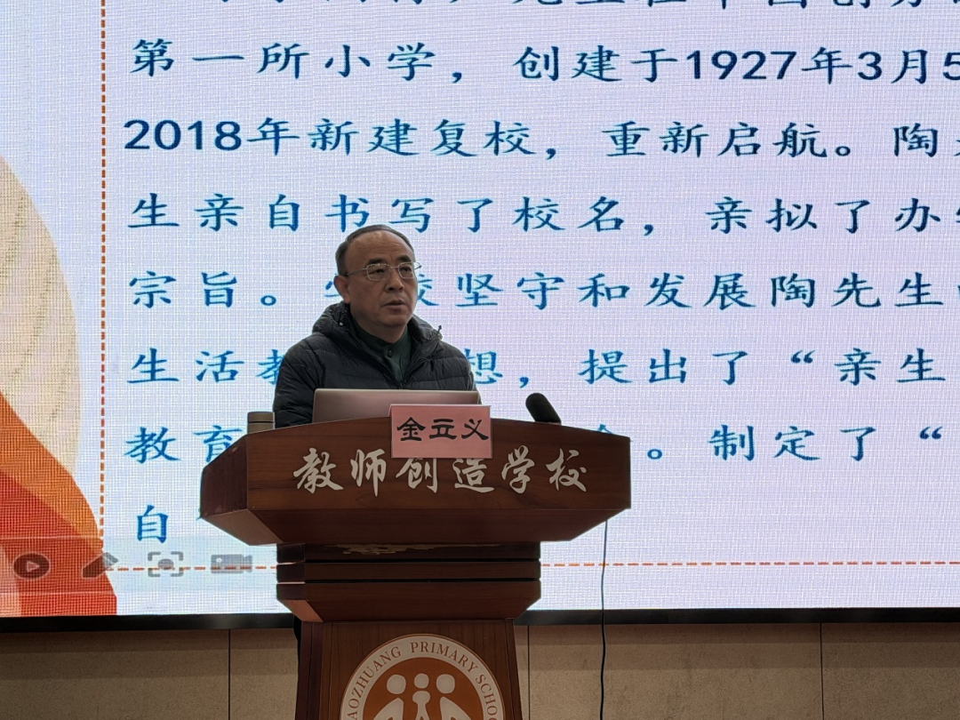 活动伊始,江苏省特级教师、南京市晓庄小学教育集团金立义书记作题为《长程作业:践行陶行知“六大解放”思想育人实践》的专题报告。金立义书记首先介绍了“亲生活教育”的办学理念。复校之际,学校明确了坚守和继承陶先生的生活教育理论,提出了“亲生活教育”办学理念,对“生活教育”做出新时代校本化的阐释与建构。南京市晓庄小学有着深厚的历史底蕴。这里是伟大的人民教育家陶行知先生于1927年3月5日在中国创办的第一所小学。2018年9月,学校新建复校,重新启航。校园每一处角落都是亲生活教育思想的鲜活体现,从行知文化到自动课堂,从“三力”教师打造到作业变革,都是对生活教育思想在新时代的实践。