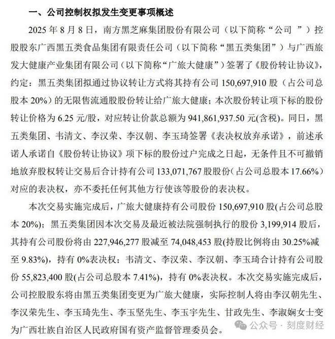 《刻度财经》发现,黑芝麻于12月10日官宣控制权拟变更,控股股东黑五类集团拟以9.42亿元对价,将20%股份转让给广西国资背景的广旅大健康,实控人将变为广西国资委。