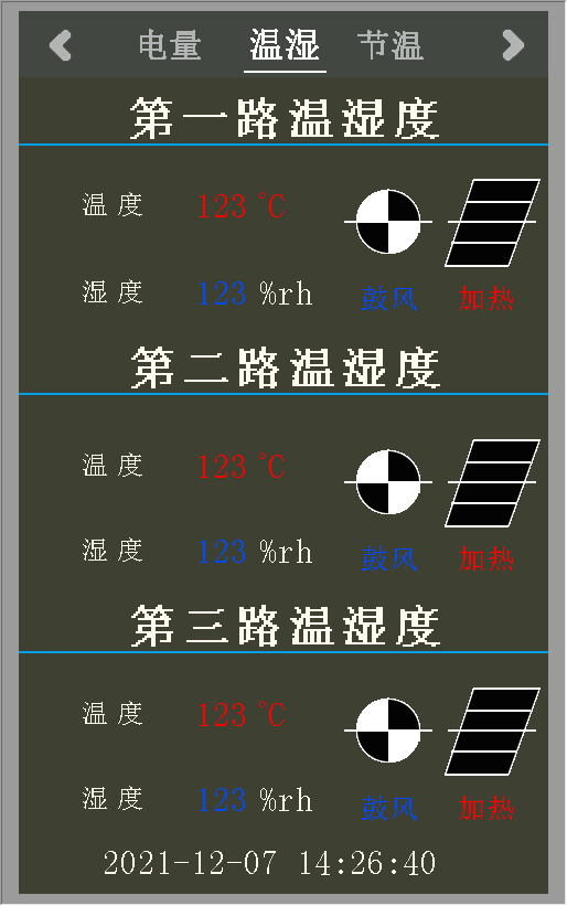 (1)温湿度显示界面:采用数字式温湿度控制,当环境相对湿度≥85%,启动加热,当相对湿度≤77%,停止加热;当环境温度≥40℃,启动风扇鼓风,当温度≤35℃,停止鼓风。当环境温度≤5℃,启动加热,当环境温度≥13℃,停止加热。ASD500可测量并采用LCD显示现场环境的温度和湿度,带有加热、鼓风控制接点,可根据需要,自行设定加热、除湿、鼓风的上下限。