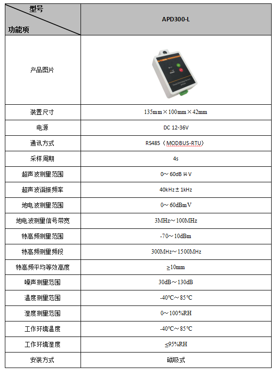 APD300-L中压开关柜局部放电监测装置通过通过特高频传感器(UHF)、地电波传感器(TEV)和超声波传感器(AE)监测检测电气设备运行时的局部放电信号,从而判断高压电气设备内部是否存在绝缘隐患,提前预警,保障电力系统安全可靠运行。
