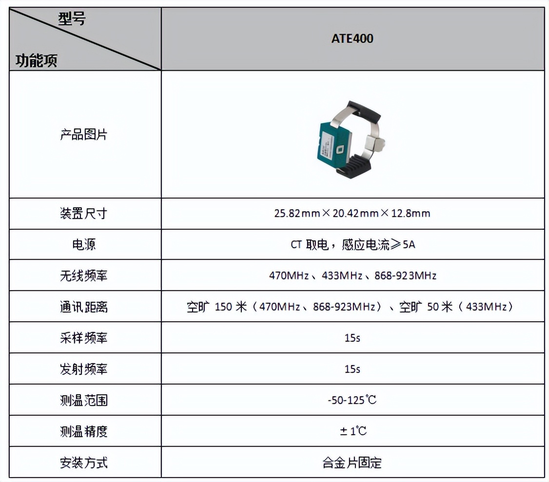 无线测温传感器ATE400可用于3~35kV户内开关柜,包括中置柜、手车柜、固定柜、环网柜等多种开关柜;也可用于0.4kV低压柜,包括固定柜,抽屉柜等。可安装于柜内任何发热点上,利用无线数据传输技术实时发送监测数据,再通过接收装置将温度数据传输到显示装置或者远程监控系统。