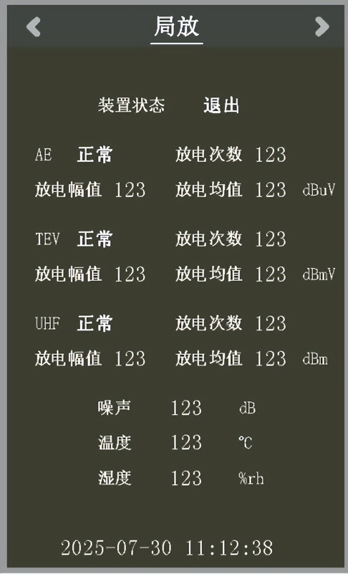 (3)局放显示界面:局放装置APD300-L磁吸在开关柜内,再通过RS485接ASD500的第二路RS485(即背部端子85、86),测控装置可以显示超声波(AE)、地电波(TEV)、特高频(UHF)的放电幅值、均值和次数,以及环境噪声、湿度和温度。AE幅值超过AE报警定值同时AE放电次数超过25次,AE报警标志位致1;TEV幅值超过TEV报警定值同时TEV放电次数超过25次,TEV报警标志位致1;UHF幅值超过UHF报警定值同时UHF放电次数超过25次,UHF报警标志位致1。