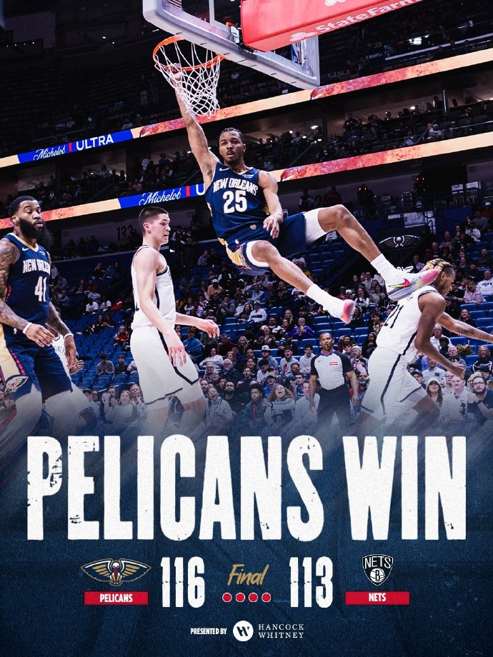 鹈鹕今天在主场116-113险胜篮网,终结了两连败,也送给篮网5连败。鹈鹕目前战绩为10胜33负,依旧排在西部倒数第一。篮网战绩也只有11胜27负,排在东部倒数第三。