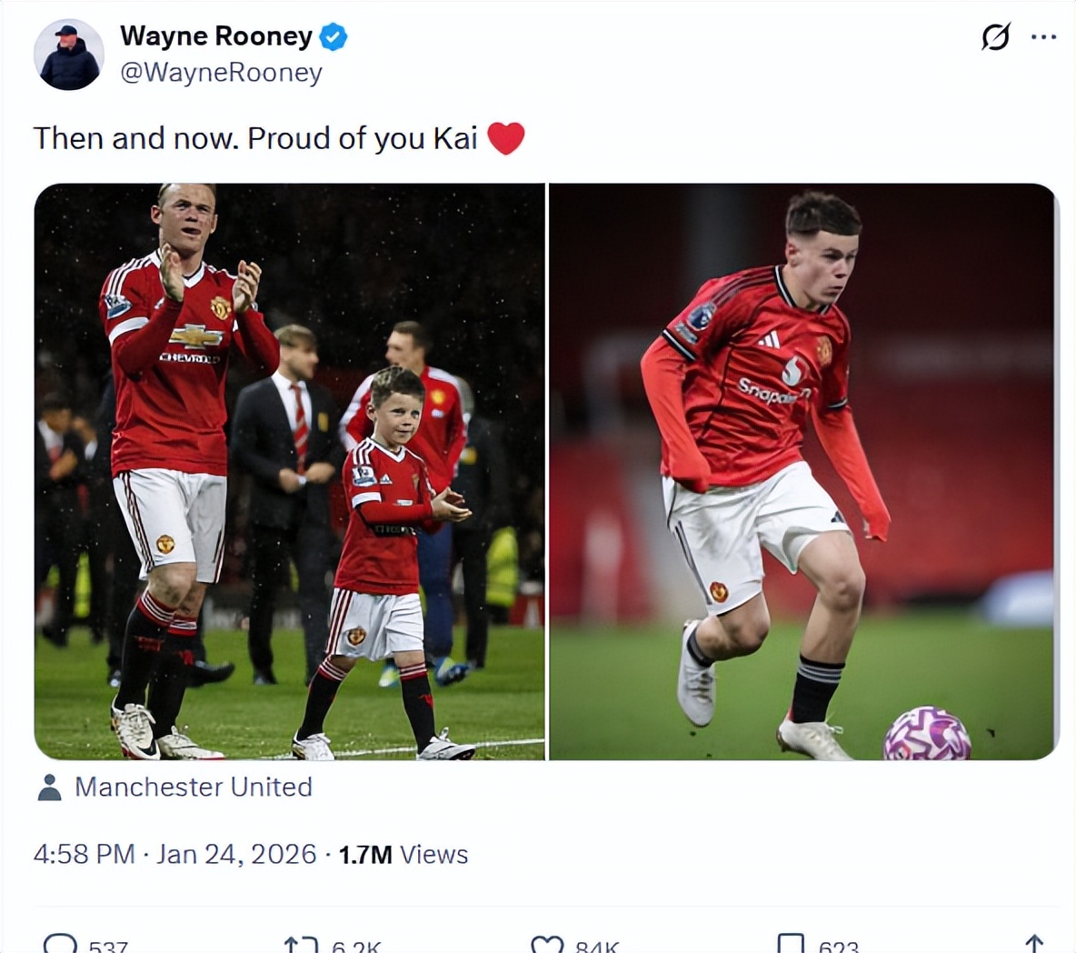 血浓于水。曼联传奇球星韦恩·鲁尼的长子,16岁的凯·鲁尼,在重返U18青年队的比赛中展现了他的潜力,贡献了一次精彩的助攻。曼联U18青年队火力全开,在25日于英格兰卡灵顿训练基地举行的U18英超北部赛区比赛中,以6-1大胜德比郡。凭借这场胜利,曼联与领头羊曼城之间的积分差距缩小到仅差1分,青年联赛冠军的争夺也更加激烈。据英国《太阳报》报道,本场比赛最大的看点无疑是凯·鲁尼的回归。凯·鲁尼在U16青年队展现出了非凡的实力,并跳级升入U18青年队。他在下半场第25分钟替补路易斯·布拉德伯里出场,完成了自己的U18首秀。在看台上,父亲韦恩·鲁尼与他的好友队友约翰·奥谢坐在一起,一边喝着热饮,一边密切关注着儿子的一举一动。凯·鲁尼替补登场后立刻展现了自己的实力,在下半场尾声阶段,他用一记精彩的传球助攻诺亚·阿贾伊破门得分。随后,阿贾伊又接到凯的传球,晃过防守队员后轻松推射入网。比赛临近结束时,JJ·加布里埃尔为凯创造了一次绝佳的得分机会,可惜未能把握住。凯·鲁尼已经展现出了他在俱乐部的潜力。本月初,在英超杯半决赛对阵诺维奇U16的比赛中,他一人独进四球,帮助球队以6-4获胜。