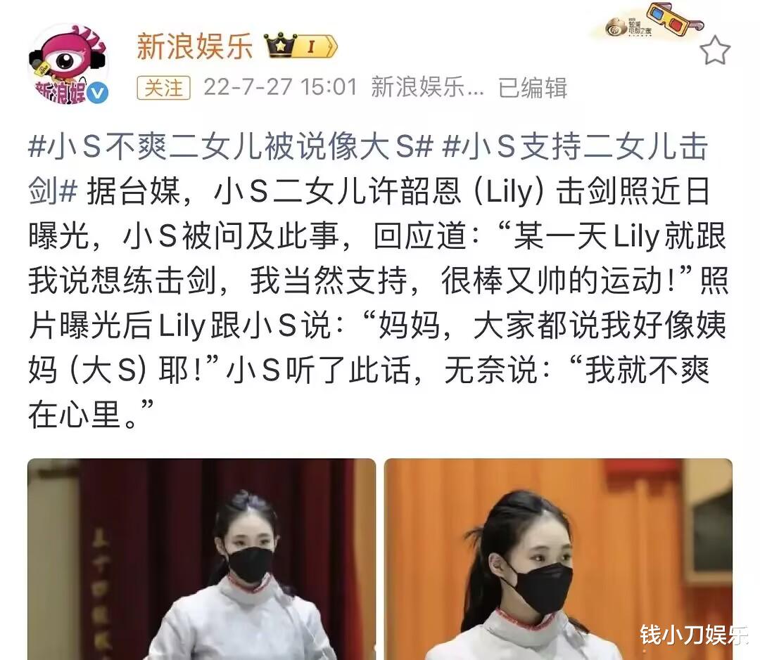 22年时,小S二女儿照片曝光后,很多人说她像姨妈大S,她跑去跟小S说,小S:我就不爽在心里。