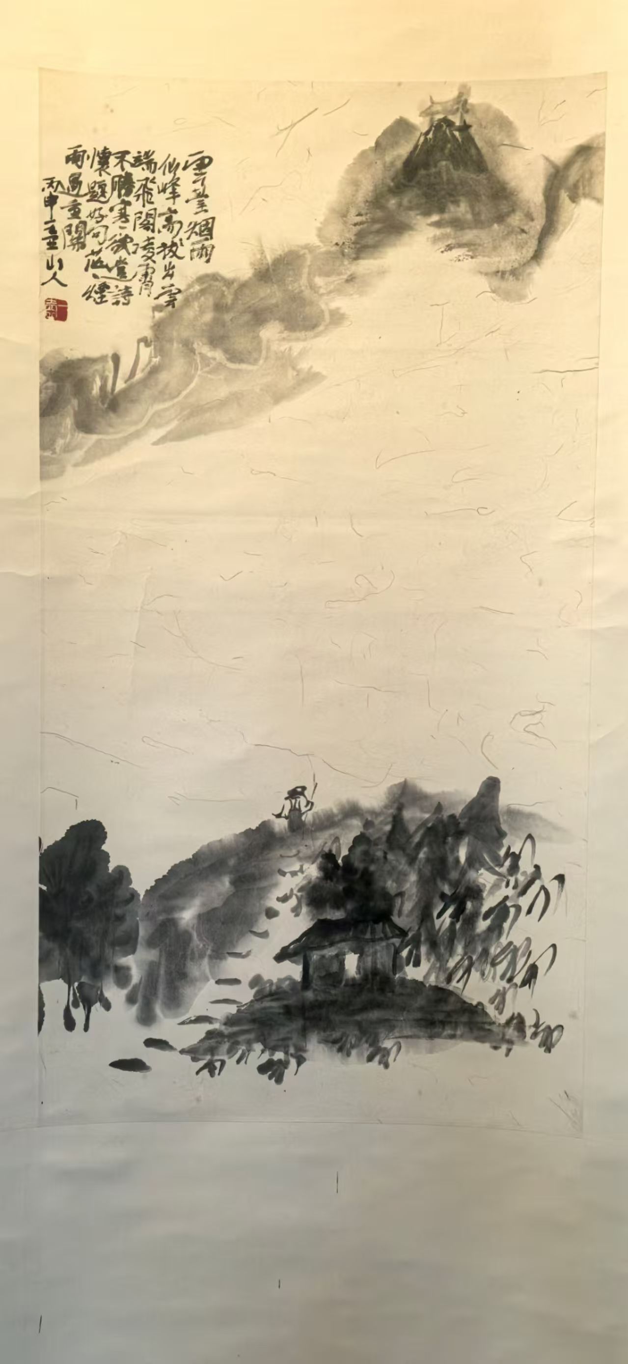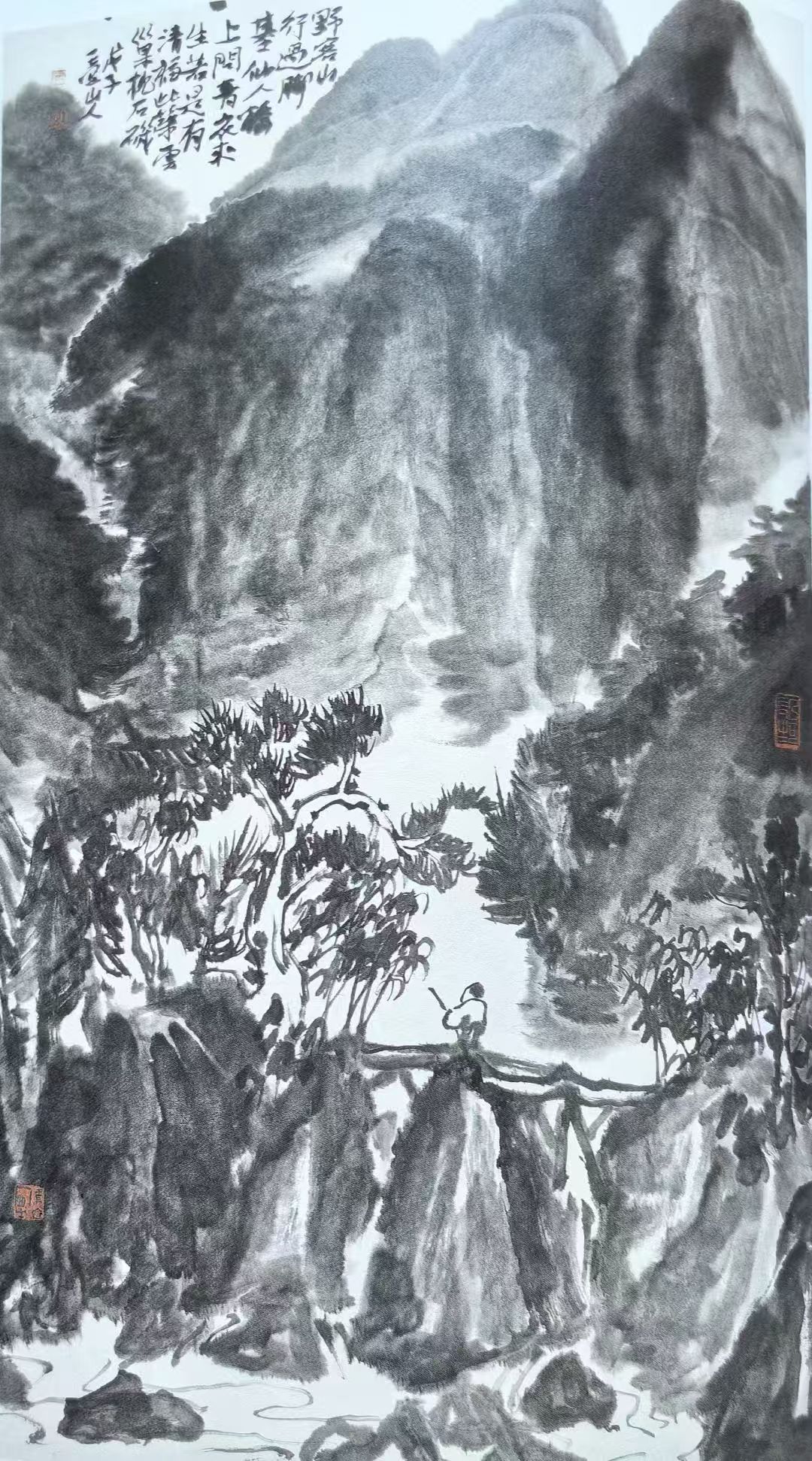 在他的山水画中,你常常会看到一个可能无法被一眼瞧见、需要仔细找寻一番的小人,或坐或行,隐没于山石林泉之间。就比如在这件悬挂于展厅中央的作品中,小人隐隐站于林边桥头,举着竹杖,静观从山涧中飞腾而下的瀑布。