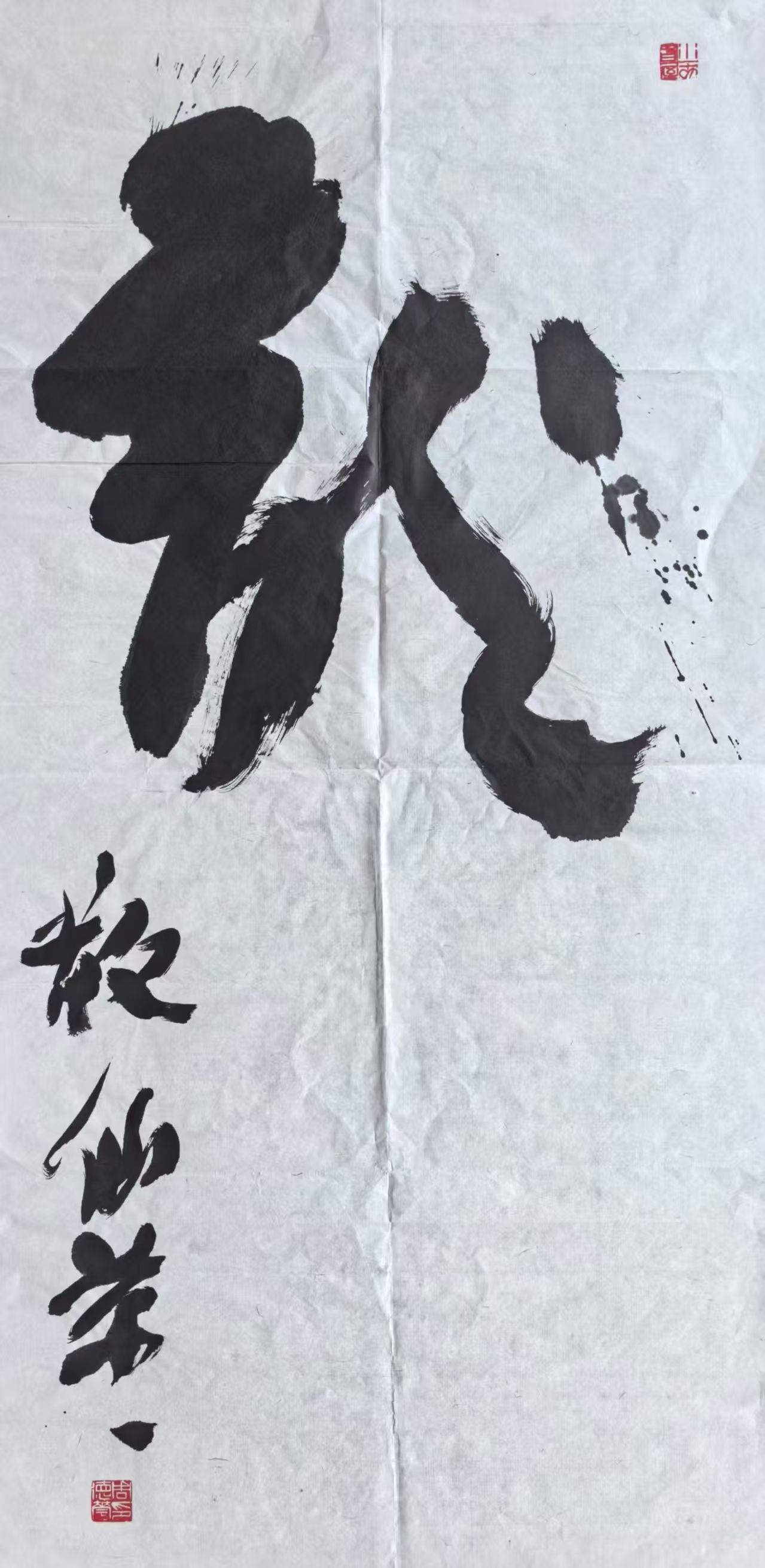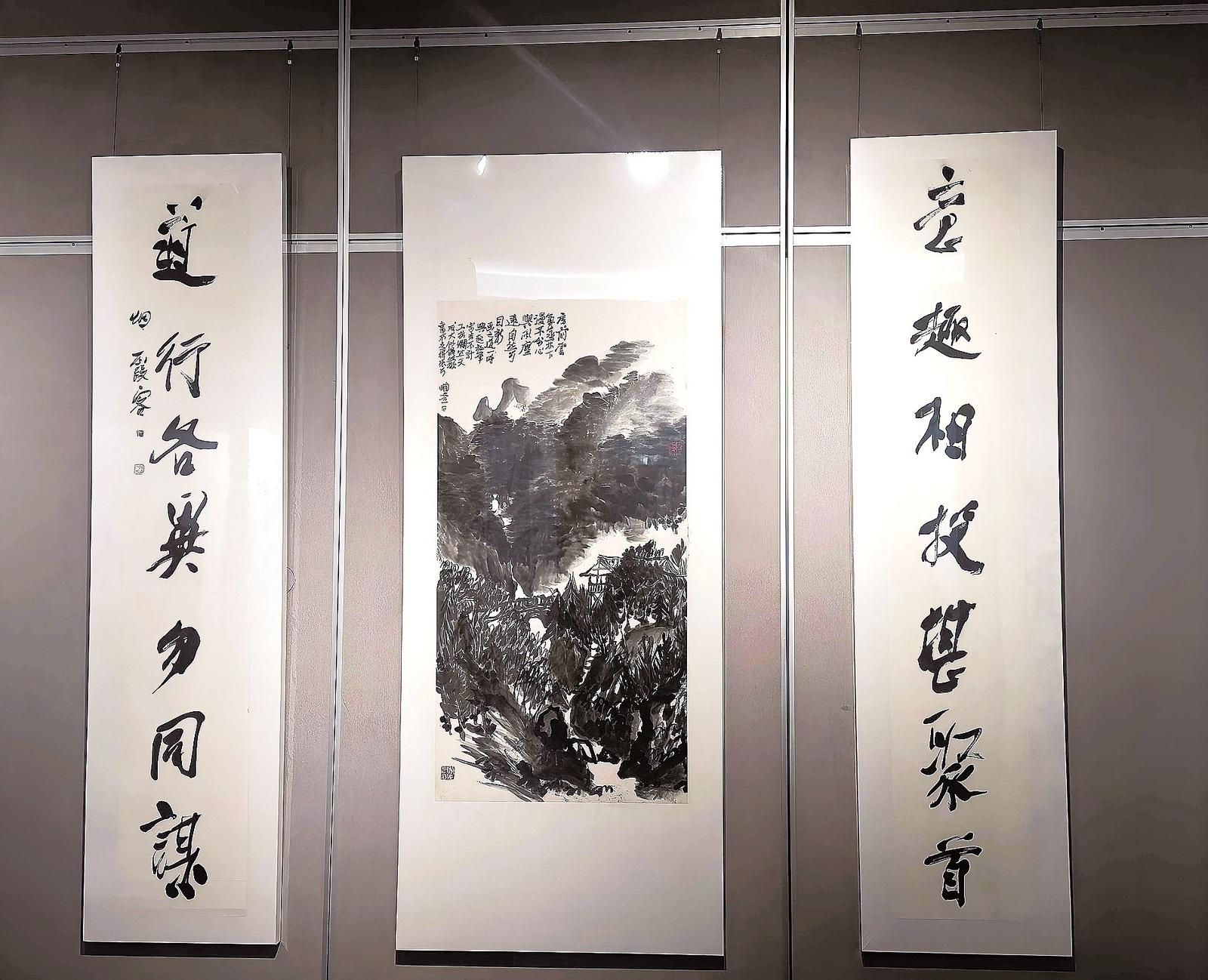 路桥书画院,展厅正中,一件三联式书画作品被缓缓挂起。