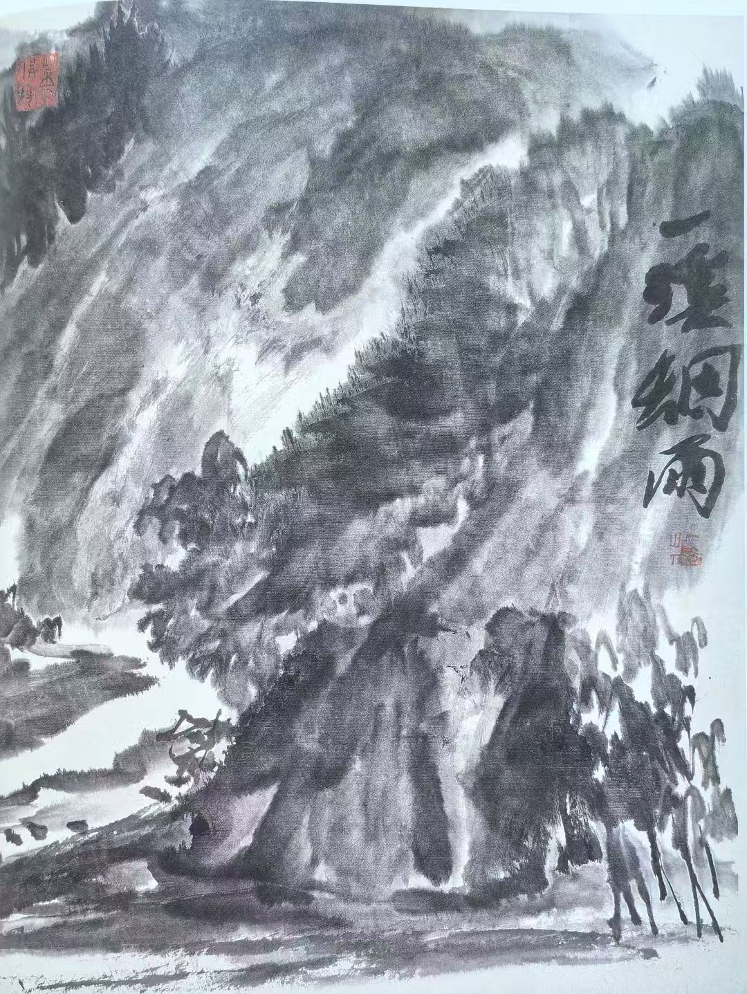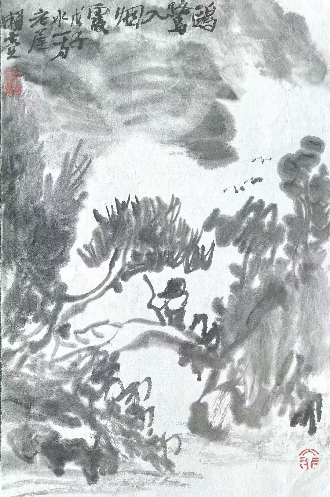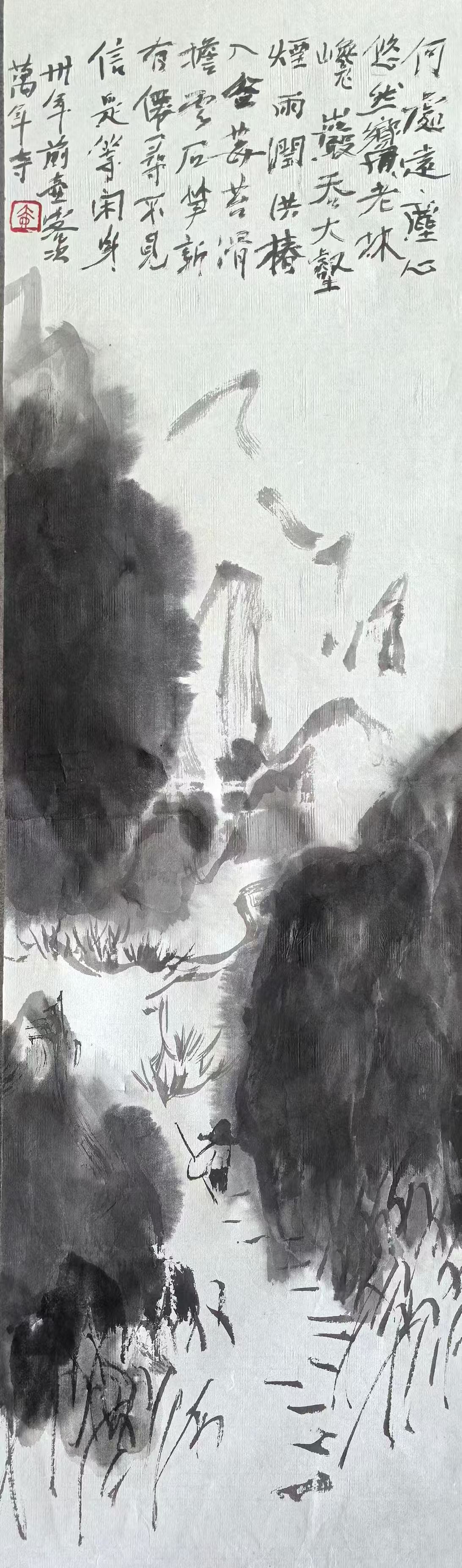 周德华以湿墨破墨写山势,用飞白与侧锋点染林木生机,虚实相生,气脉贯通。留白处理尤为节制,既是云雾,也是呼吸之所,画面在静谧中暗含流动。