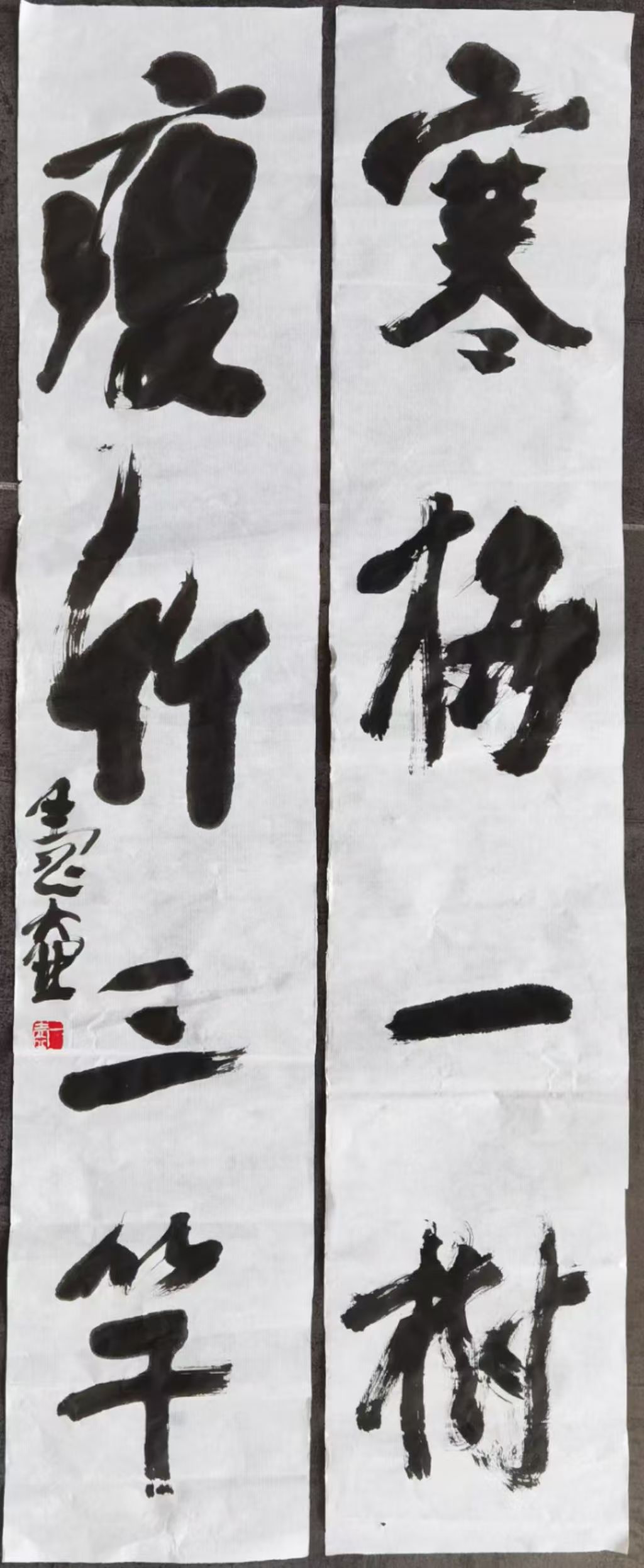 上下两联书法在两侧,笔意自然流转,与画面形成精神上的互文。上联偏重“情”,行气舒展,墨色温润,写“意趣相投堪聚首”;下联偏重“道”,用笔稳健内敛,结构含蓄,写“道行各异勿同谋”。二者一收一放,一理一情,既形成书法层面的对照,也映照了中国文人传统中“道行合契、意趣相投”的人生理想。