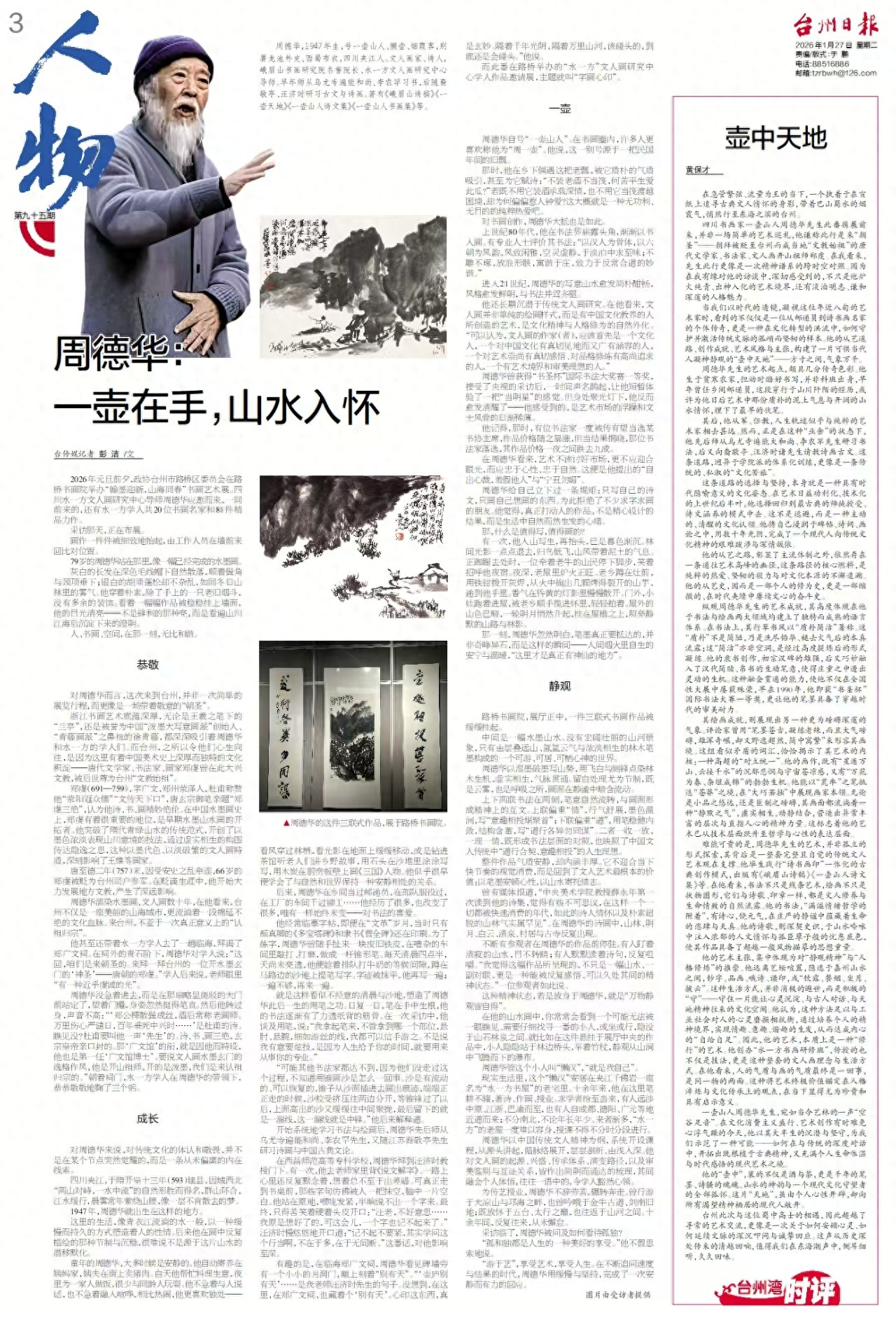 他甚至还带着水一方学人去了一趟临海,拜谒了郑广文祠。在祠外的青石阶下,周德华对学人说:“这回,咱们是来朝圣的。来拜一拜台州的一位开水墨玄门的‘神圣’——唐朝的郑虔。”学人后来说,老师眼里“有一种近乎虔诚的光”。