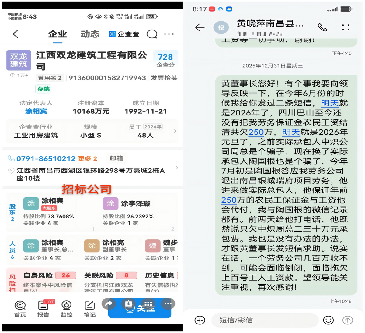 据知情人透露,该项目最初由多家公司“围标”中标,随后被四川巴山以“管理费”名义转包给中炽,中炽又加价“卖标”给陶国根——每一次转包,都是“空手套白狼”的套利,农民工的工资,早成了“转包链条里的牺牲品”。