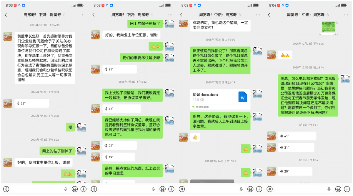 2025年12月21日,新广华劳务拿着聊天记录找陶国根对质,他终于摊牌:“我只欠中炽周总二三十万承包费,你找他要去,别找我”——全然忘了自己当初“无条件付款”的承诺,把“接盘总包”的权责,彻底甩进了项目转包的“烂账堆”里。