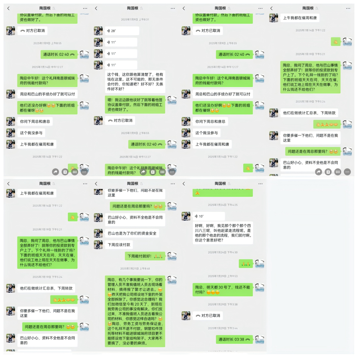 “你放心,这个钱(剩余250万)他有钱在这里,无条件会付的,你先把场退了,材料腾出来,项目问题曝光新闻稿也撤了,咱们不扯这些没用的。”(2025.7.9陶国根与新广华劳务微信聊天记录)
