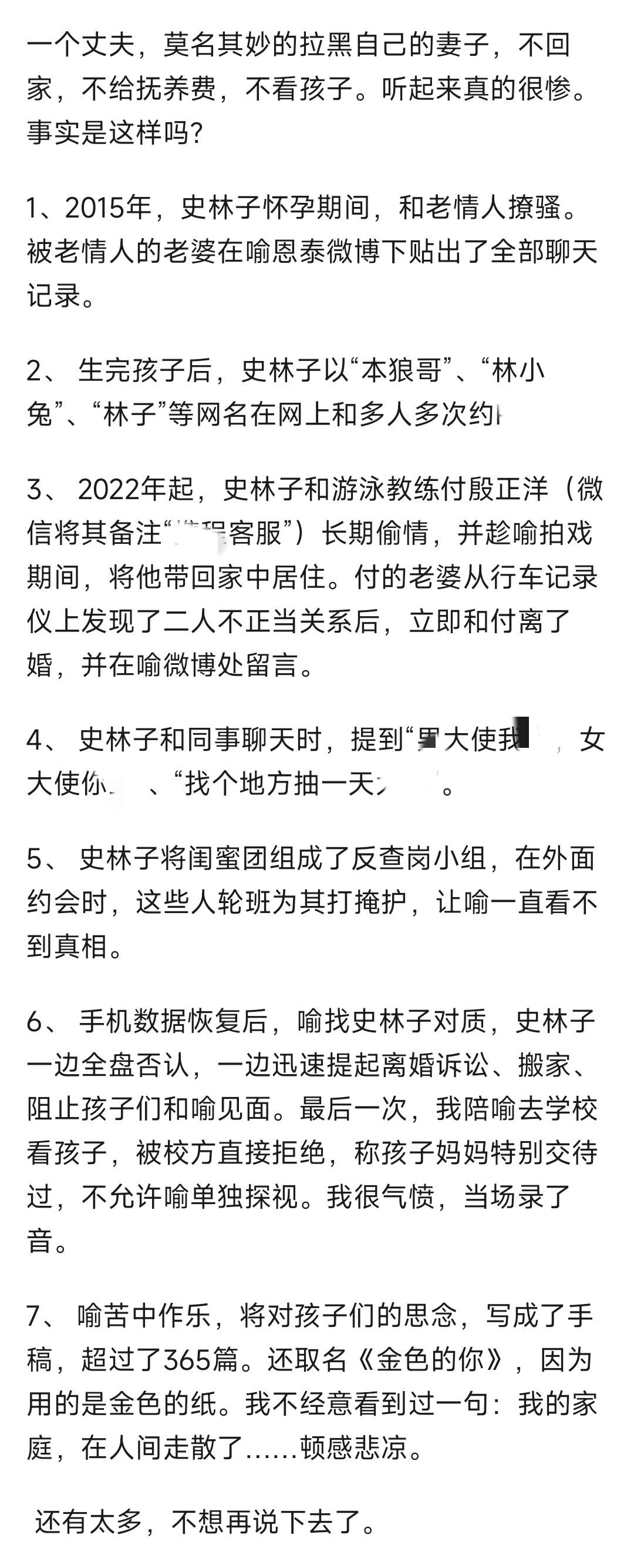 结果第二天就被打脸,事件引来反转,喻恩泰和妻子史林子的共同好友站出来发声,力挺喻恩泰,大骂史林子为了财产不择手段,接着公布大量聊天记录怒指史林子不仅孕期出轨,甚至生了孩子后还在网上与多人约P,所谓的喻恩泰不见孩子更是颠倒黑白,是她自己阻止丈夫见孩子,还指示学校校长,不允许孩子和爸爸见面。
