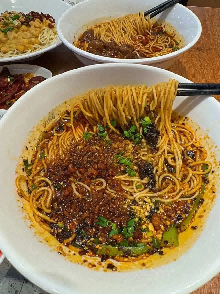 主打正宗四川担担面,传承川渝经典风味,手工制作的碱水面劲道爽滑,煮熟后淋上秘制红油、花生碎、芽菜、蒜末、芝麻酱等调料,拌匀后色泽红亮,麻辣鲜香,咸鲜微酸,香气扑鼻。面条吸饱了酱汁,每一口都层次丰富,辣而不燥,香而不腻,搭配一勺酥脆的花生碎,口感更上一层楼,是川渝地区的经典主食。