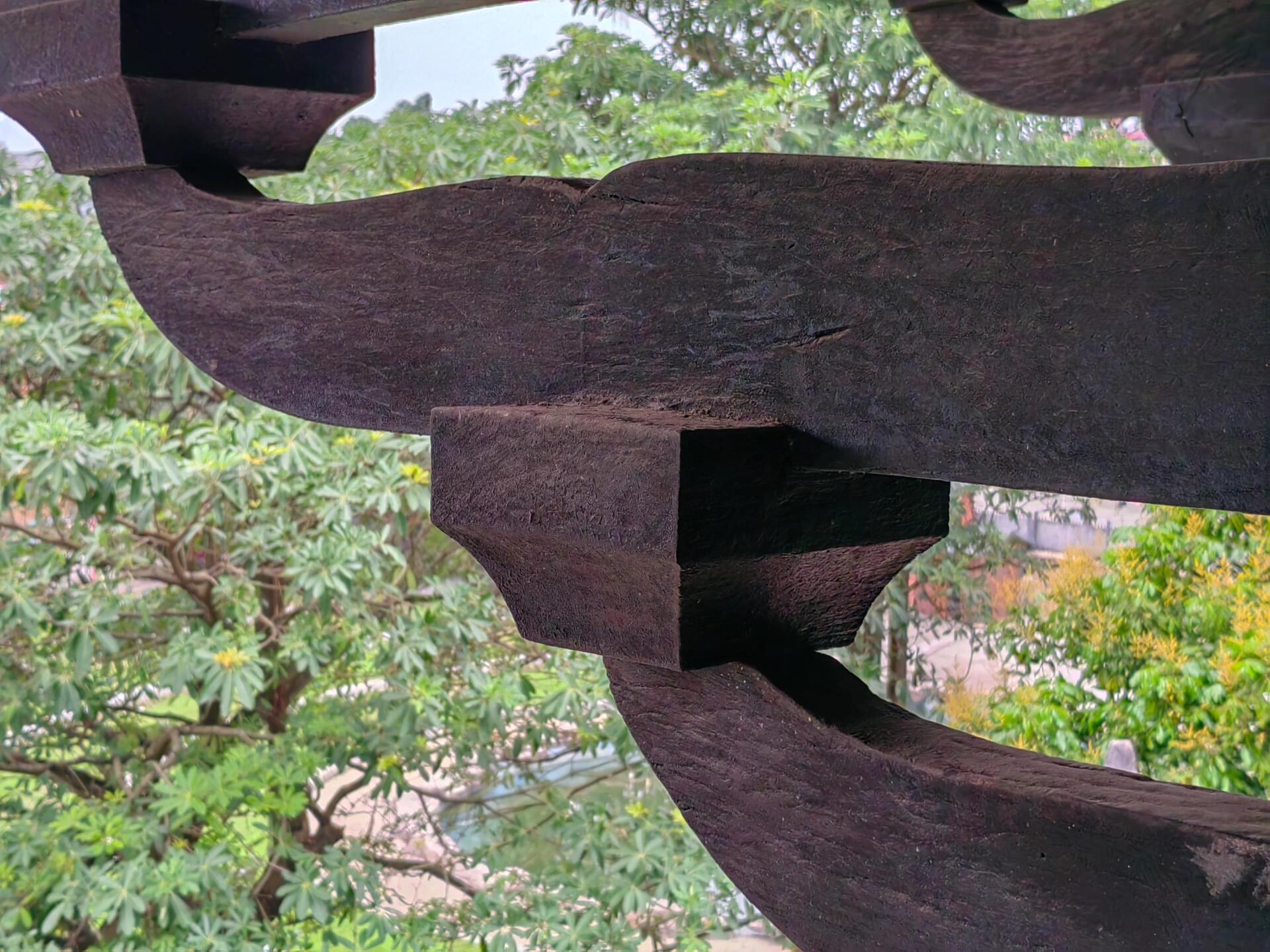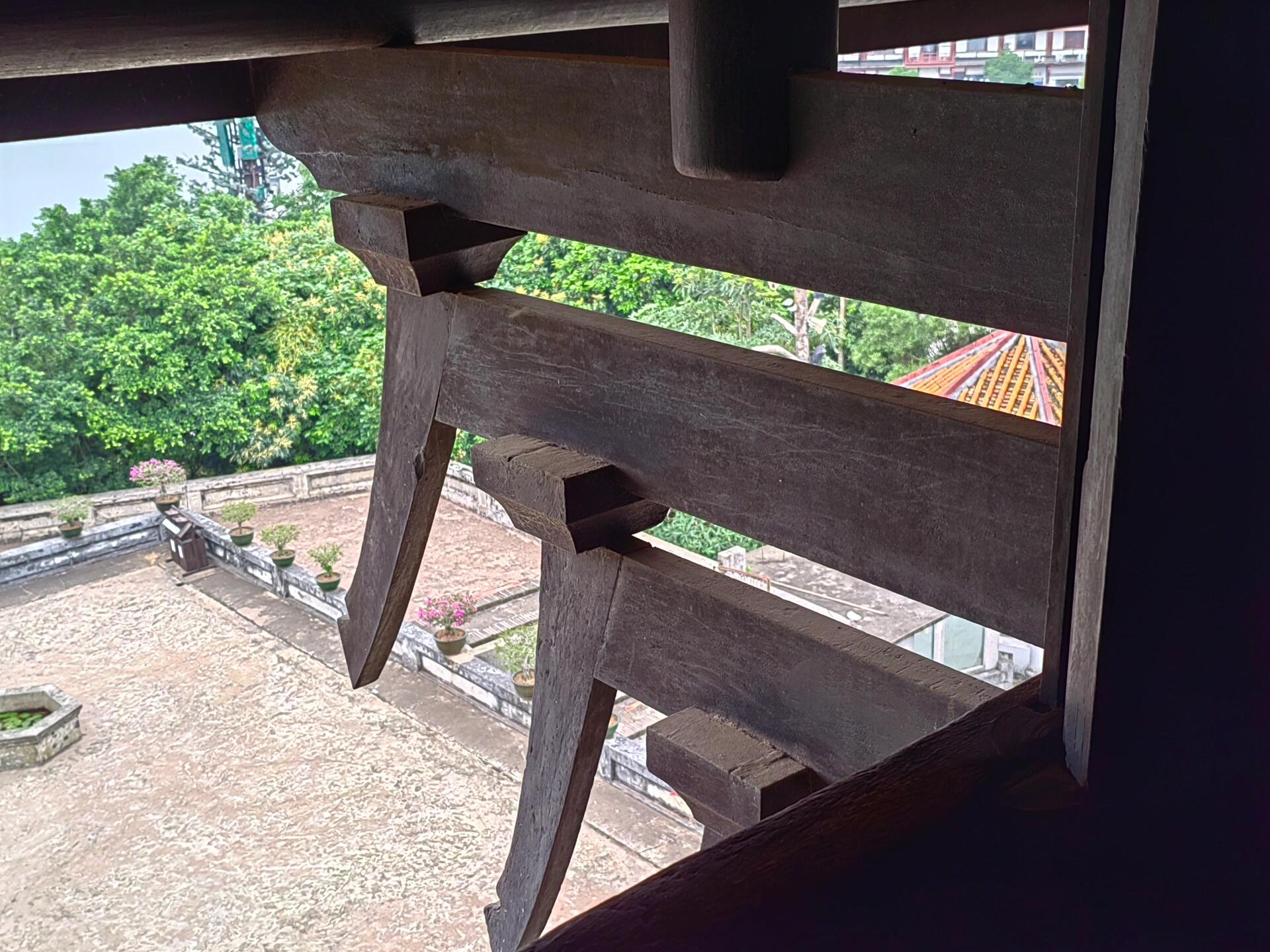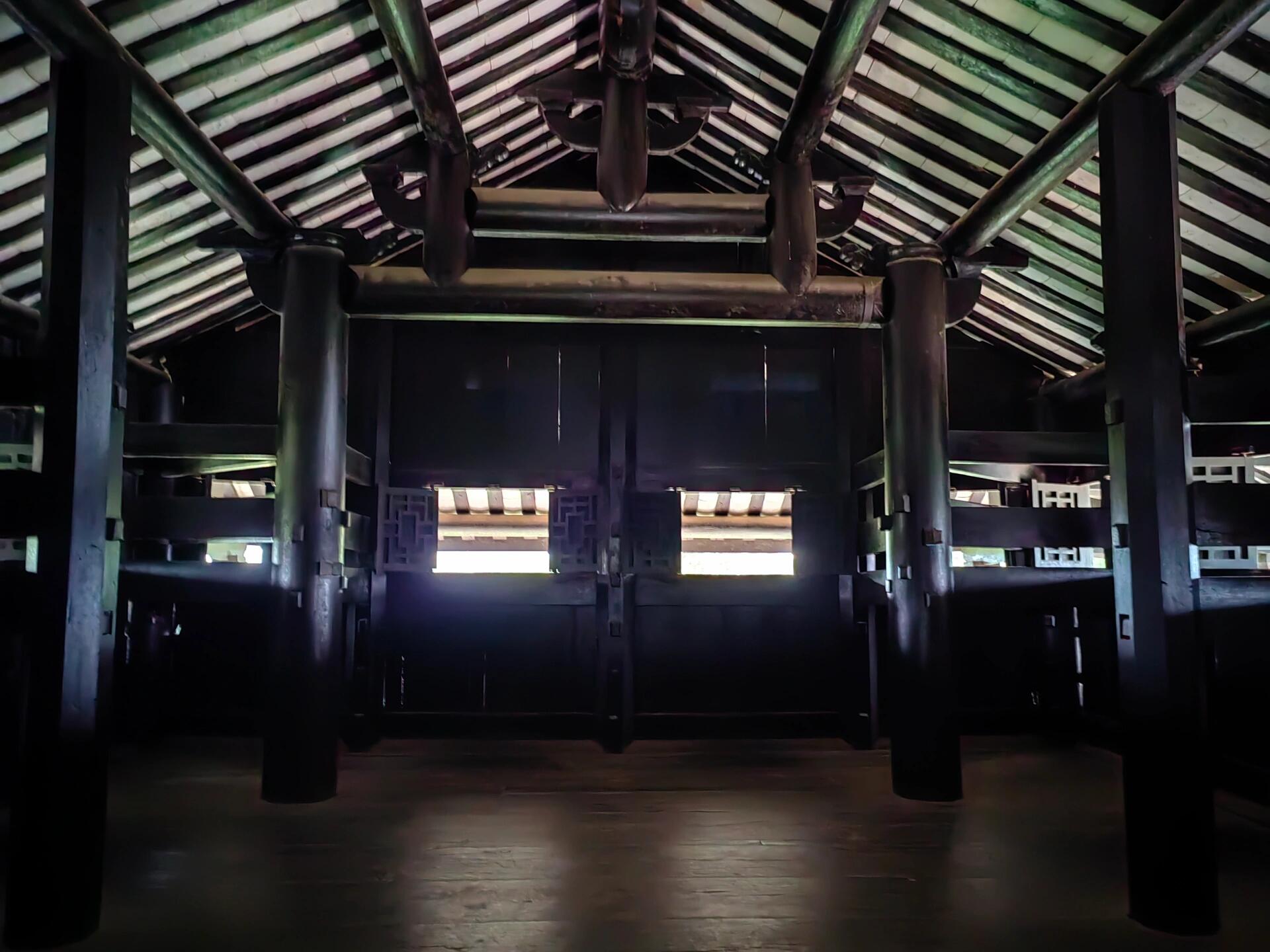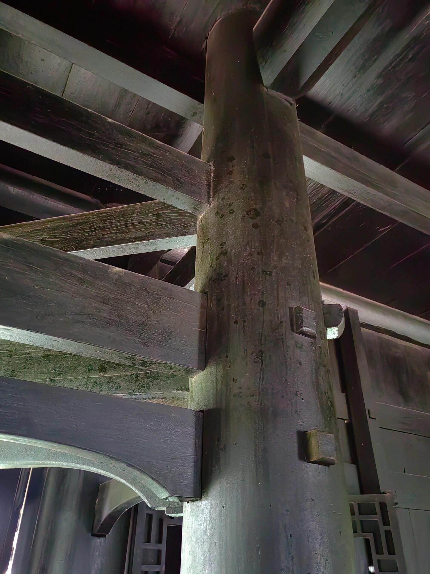 顺着楼梯往上走,木质的台阶踩上去咯吱作响,越靠近二楼,越能看清悬空柱的“玄机”。那六根内柱齐刷刷地立在二楼地板上,柱底和三楼楼板之间留着一道细缝,用手摸一摸,能清晰感觉到柱子是“悬着”的,没有任何支撑。再看柱子上下,横着架着密密麻麻的梁枋,粗的有碗口那么粗,细的也有拳头大小,它们像蜘蛛网一样把柱子和阁楼的木架连在一起。导游蹲下来,指着一根梁枋说:“这就是关键!整个阁楼有八根顶天柱,到了二三楼就变成了支点,七十二根梁枋就是杠杆,一头挑着瓦檐的重量,一头压着柱子,刚好平衡!”