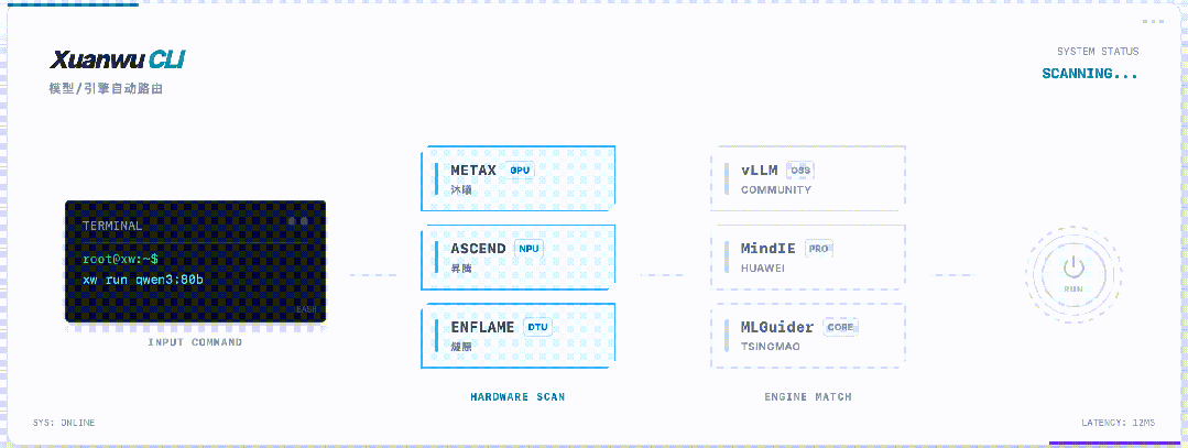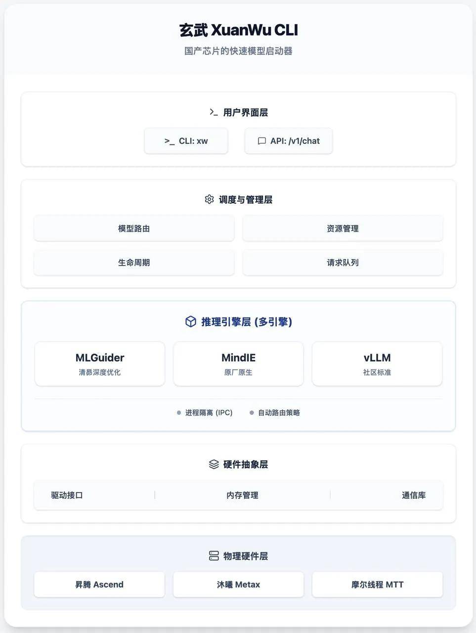 玄武 CLI 的核心价值之一,就是把复杂性收敛到系统内部:它能够自动识别华为昇腾全系列、沐曦、燧原等多款国产芯片