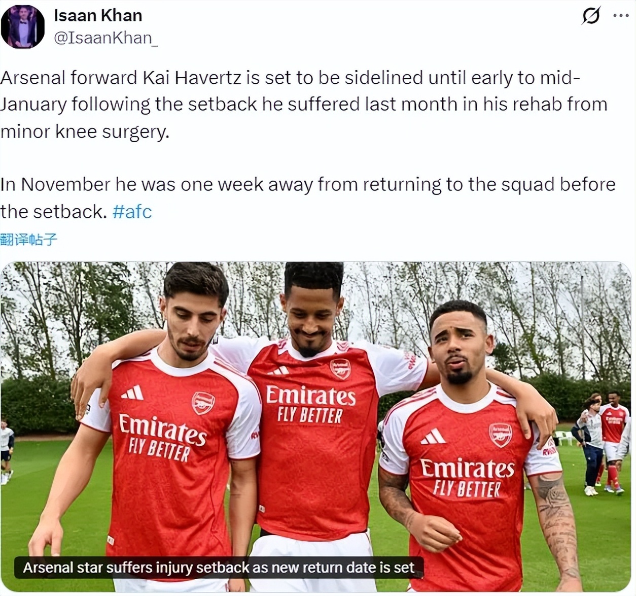 邮报记者IK消息,哈弗茨将因伤缺阵至1月中上旬,这名球星上个月时伤情出现了反复。