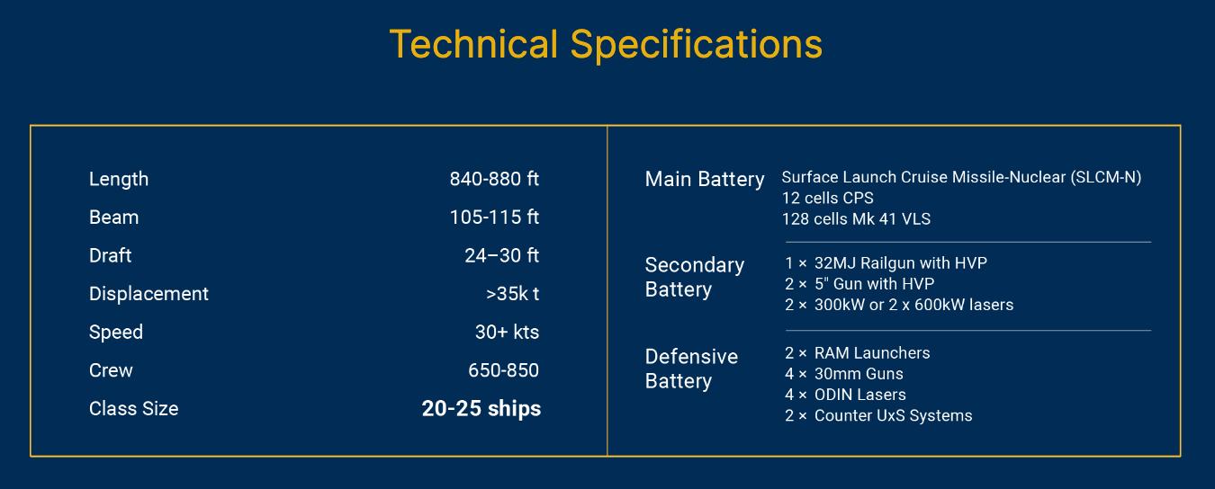 更加离谱的是,这玩意儿的预计开工时间还是2030年初!2022年开始的DDG(X)都几年了,连个影子都看不到,结果3.5万吨的大家伙在2030年就打算开工,这合理吗?舰船吨位越大,设计建造难度也就越大,3.5万吨的特朗普级战列舰断然没有后来居上超越DDG(X)的可能。完全说不通。