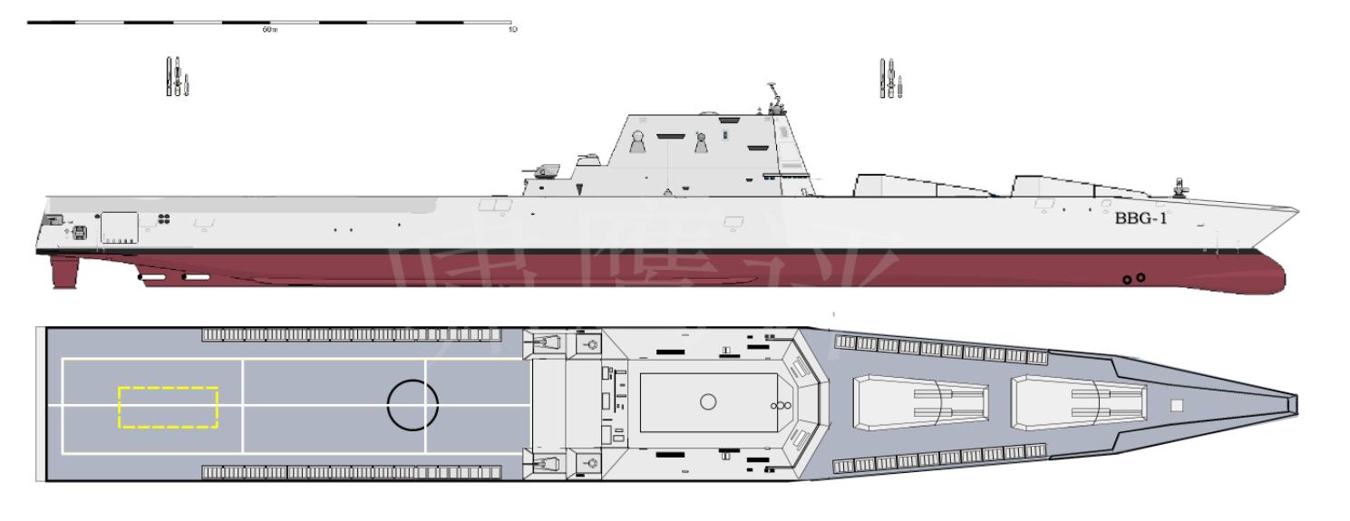 MK-45型127MM舰炮、2.2米直径的APM垂发单元,MK41垂发,4门MK-38型30MM速射炮。4.3米的SPY-6型S波段有源相控阵雷达SEWIP III电子战系统。都是现成的,舰艇桅杆的集成度和DDGX也就一个水平,兼容难度也不算大。