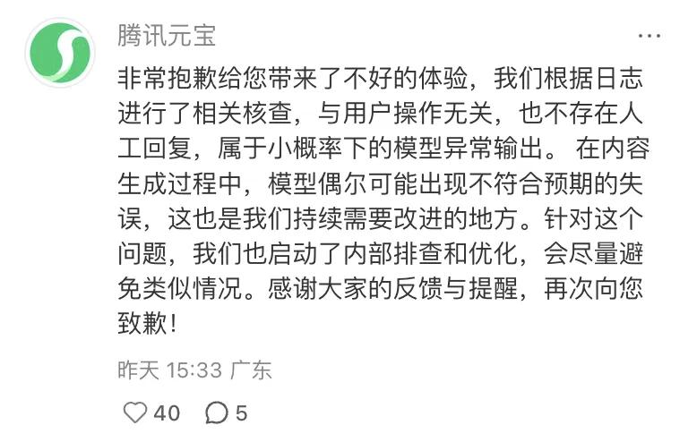 腾讯元宝 官方回复: