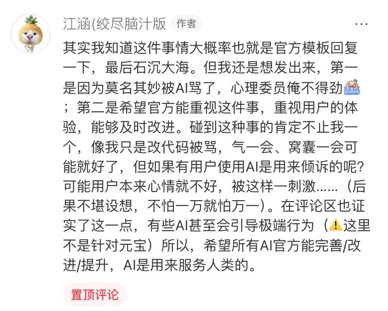 2026 年 1 月 3 日,网友@江涵(绞尽脑汁版)发文称:用元宝改代码被辱骂 + 乱回。