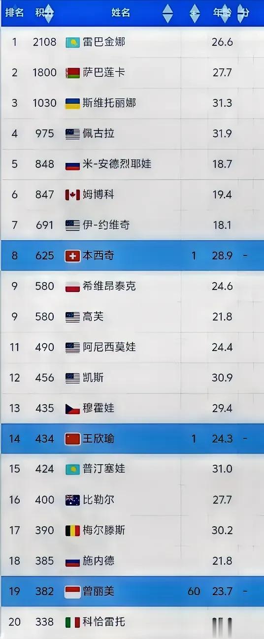 新赛季WTA世界排名榜⬆️⬆️