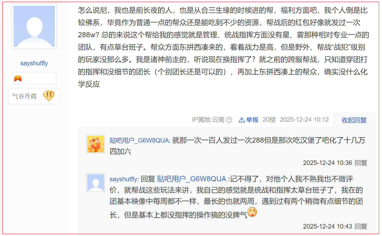 也正因此这位神豪在组建帮会时,找了几个管理来帮助他处理帮会事宜,福利部分上述神豪并没有亏待帮众,经常拿钱来给管理让他们发给帮众,但几个月的时间下来,他组建帮会成员的战力确实不低,但战绩却难看了很多。
