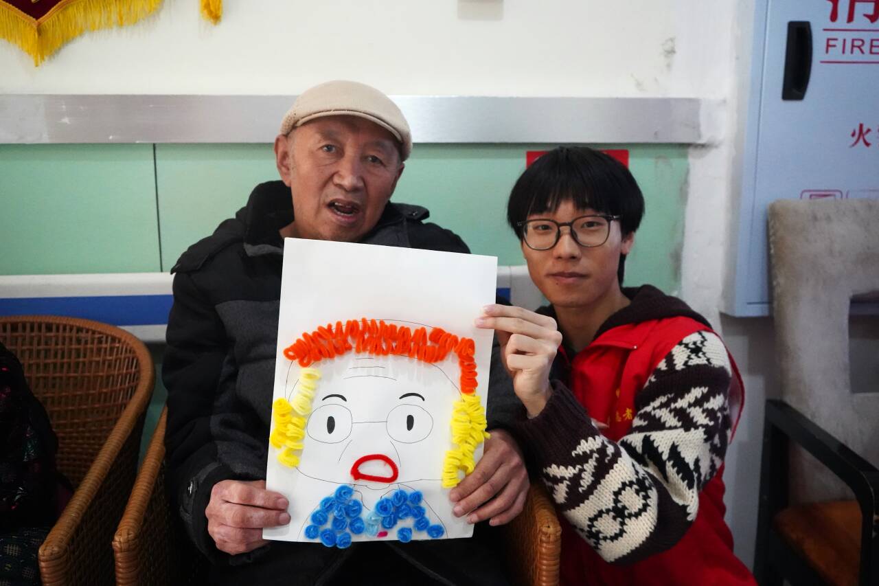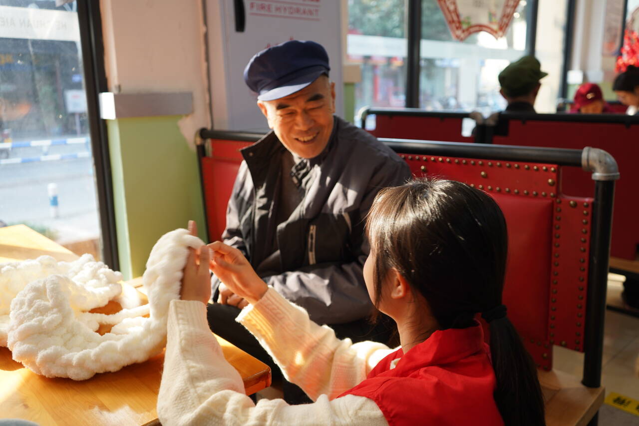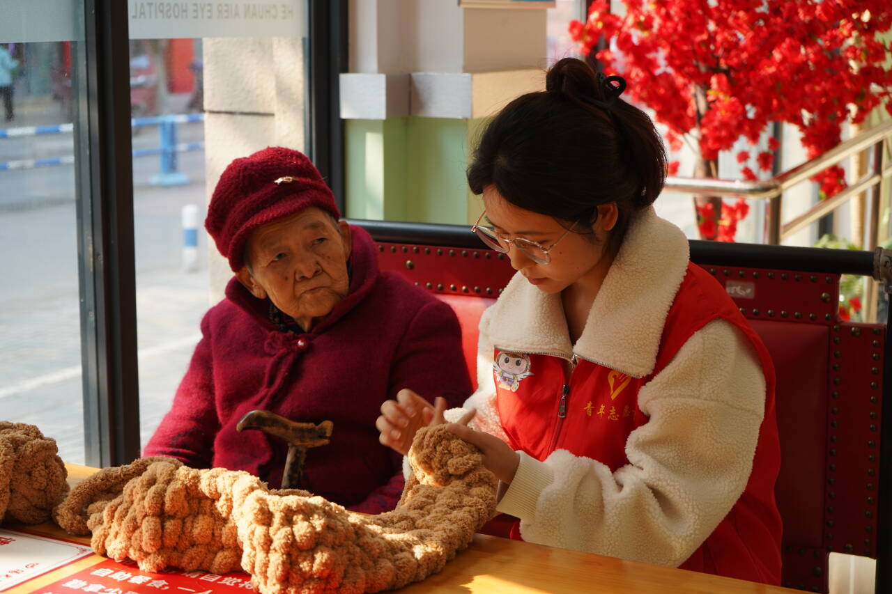 巧手织就冬日暖,创意定格温情长。活动现场,志愿者们与老人一一结对,共同进行围巾编织。老人们在志愿者指导下挑选绒线、学习编织技法,现场交流融洽。围巾完成后,大家戴上亲手制作的作品。随后,志愿者引导老人们利用扭扭棒进行创意造型游戏,将编织好的围巾与手工道具结合,设计出个性化的合影造型。通过扭扭棒手工与围巾成品的创意搭配,老人们在互动游戏中体验了艺术创造的乐趣,每个精心设计的画面都被相机记录下来,成为承载温暖记忆的独特影像。