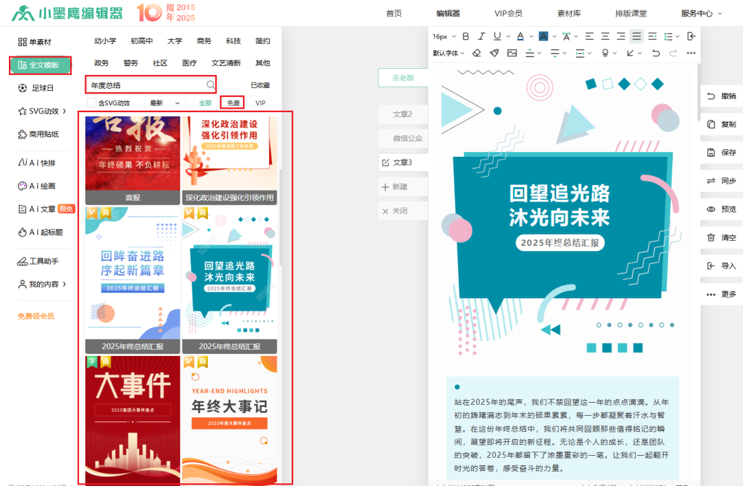 在创作微信公众号文章时,用户常常需要写年度总结报告,进行工作汇总,并制定来年计划。如何让你的年度总结既专业又吸引人?小墨鹰编辑器提供了丰富的模板,让你的推文制作变得简单快捷。