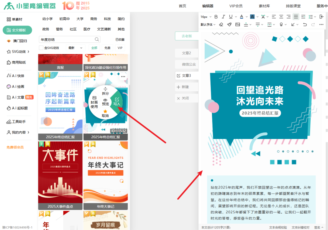 不管是企业做年度工作汇报,还是个人梳理账号成长,用小墨鹰编辑器都能让总结推文制作更轻松、呈现更专业!感兴趣的话赶紧试试,高效搞定年末总结排版~