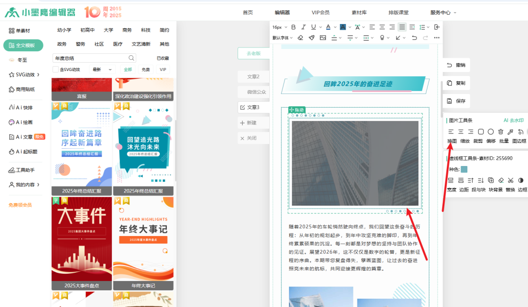 除了丰富的模板库,小墨鹰编辑器还自带「AI 文章」「AI 排版」等实用工具,支持 AI 辅助写作、快速优化排版,大大节省创作时间;模板素材还能灵活调整,让总结推文既有设计感又不千篇一律。