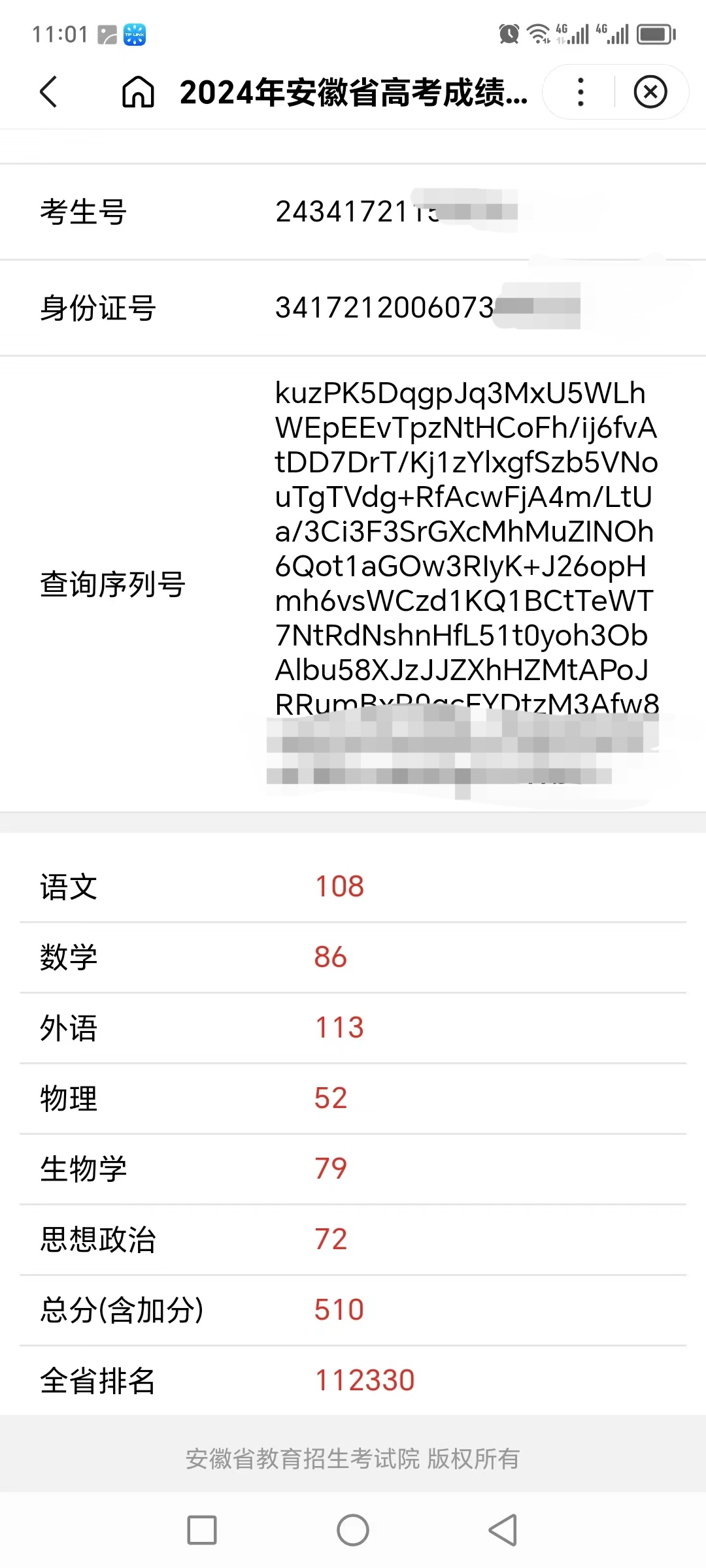 前天拿到成绩510分(语文108,英语113,数学86,物理52,生物79,政治72),虽说离一本差着4分,但简直叫飞跃,涨分150啊,她妈妈激动得大哭😄。她全班超过465二本的就只有6人,最高分540。这两天在帮她选志愿,虽然可选的有局限,但也能上一个还行的公立本科,全家萦绕在欢乐祥和之中!