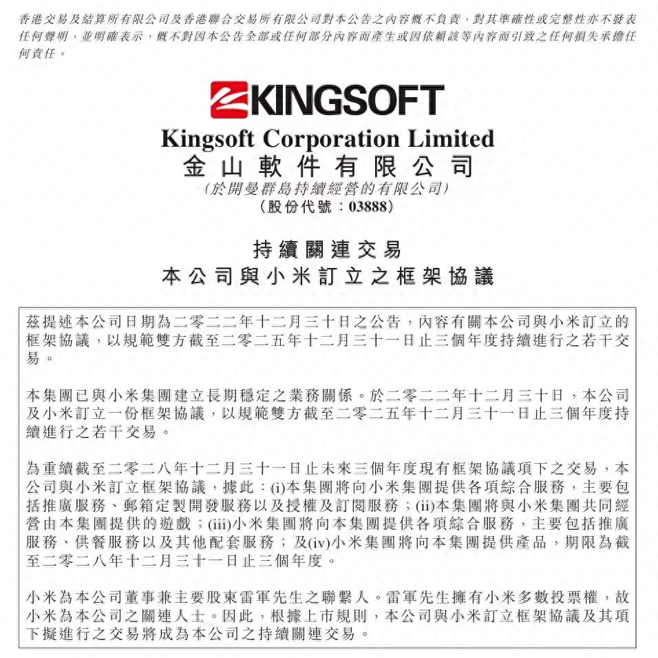 DoNews12月31日消息,金山软件今日发布公告,公司与小米签订新的框架协议,将现有合作关系延续至 2028 年 12