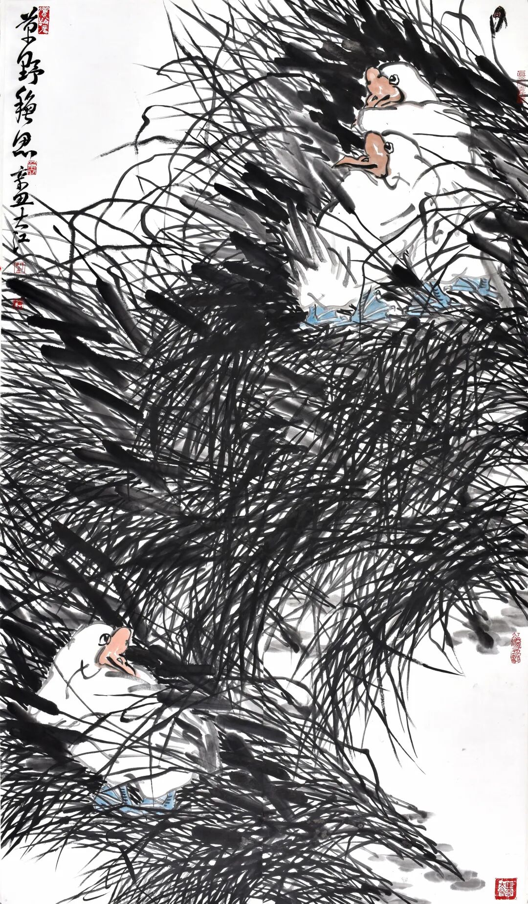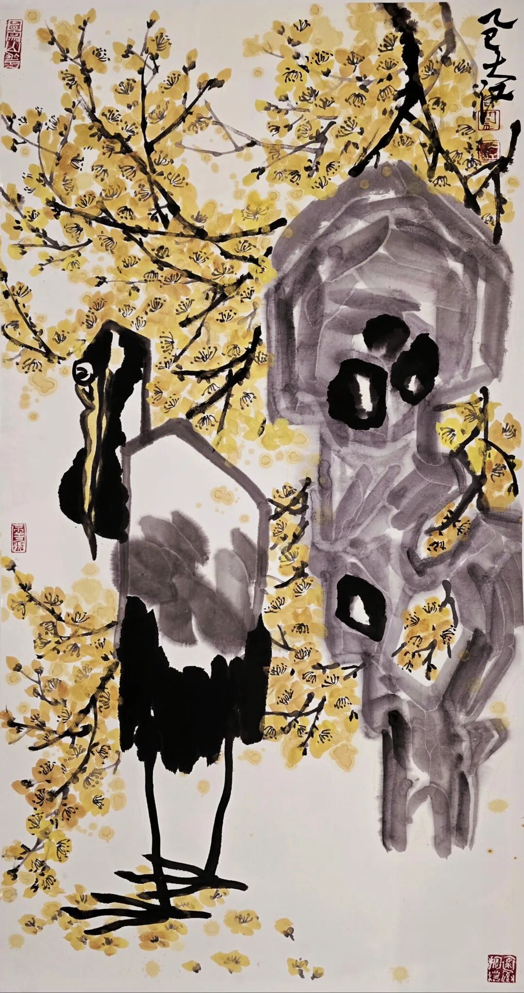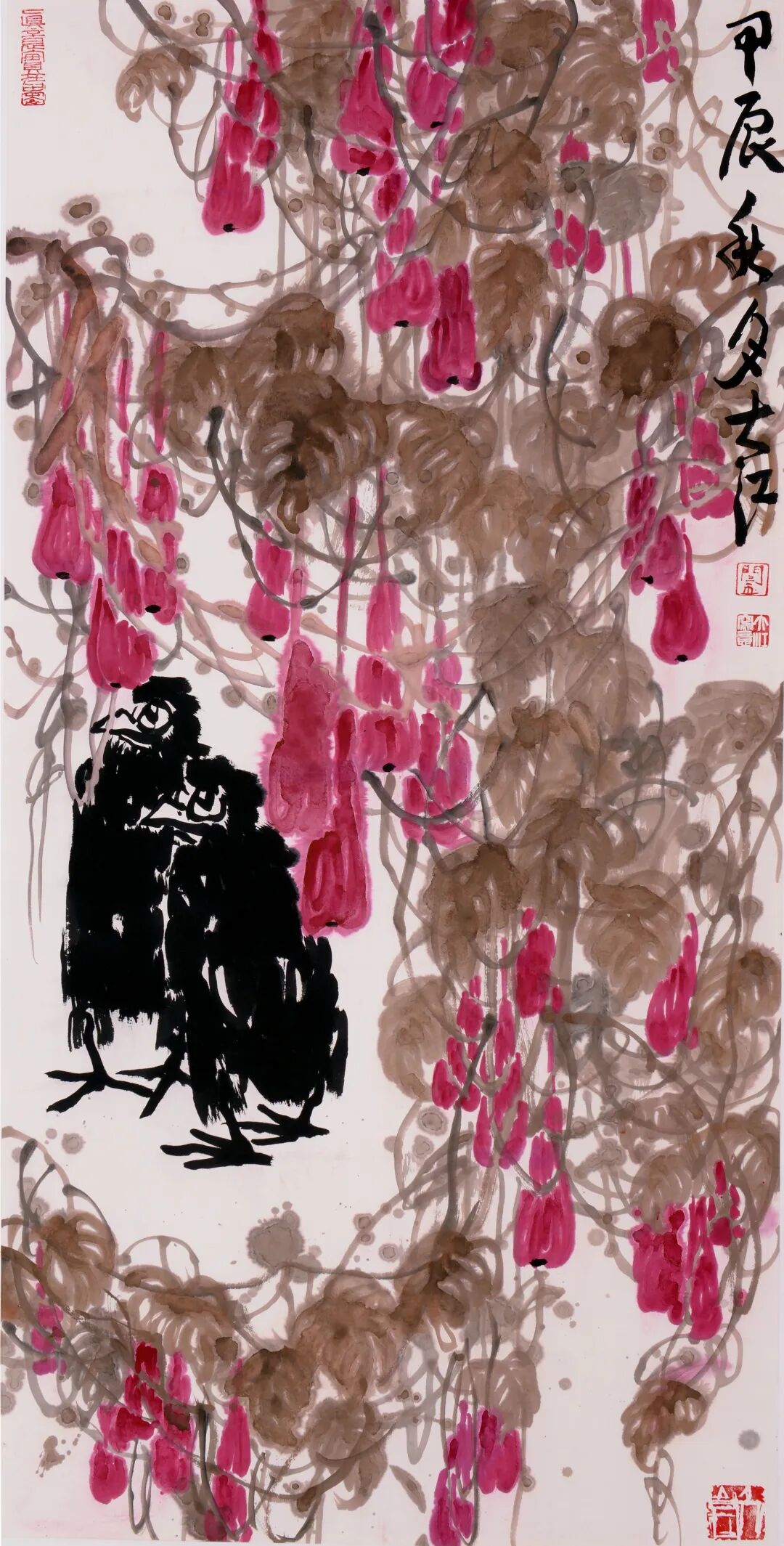 总之,闫大江的花鸟画作品是传统与现代、地域与人文的有机融合,既彰显了中国写意绘画的深厚底蕴,又展现了当代艺术家的文化自觉。他以笔墨为舟,载着对自然、生命与文化的思考,在大写意花鸟画领域开辟出一片独特的艺术天地。