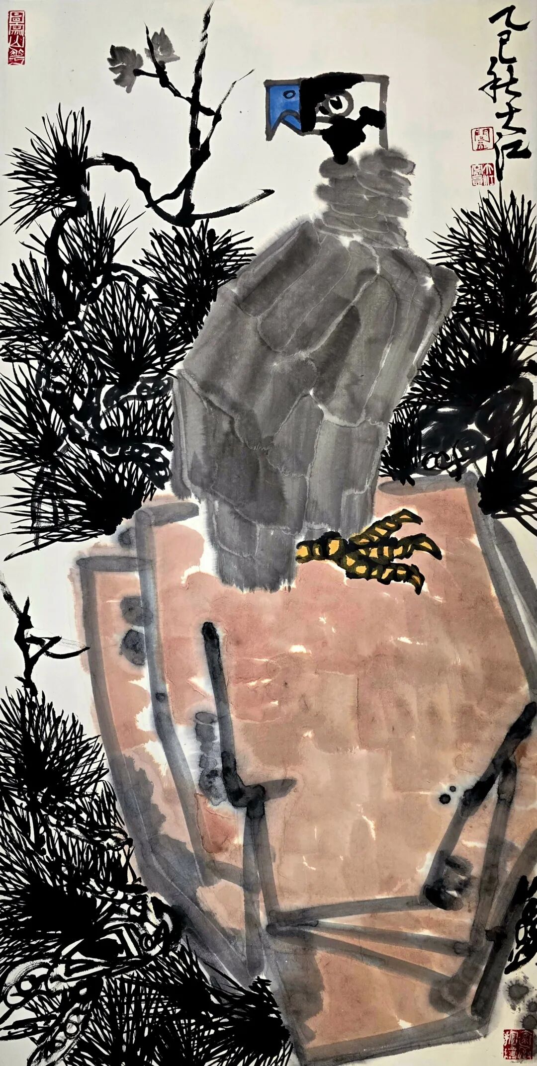闫大江的大写意花鸟画以书法用笔为骨,线条凝练老辣,既有篆书的古朴厚重,又含草书的飞动流畅。他擅用长锋羊毫笔,通过提按、转折、顿挫等笔法变化,使画面呈现出“干裂秋风,润含春雨”的丰富层次。例如在《守望家园》中,枝干的勾勒以中锋行笔,苍劲如屈铁;叶片的点厾则侧锋铺毫,墨色浓淡干湿自然晕染,形成强烈的视觉对比。
