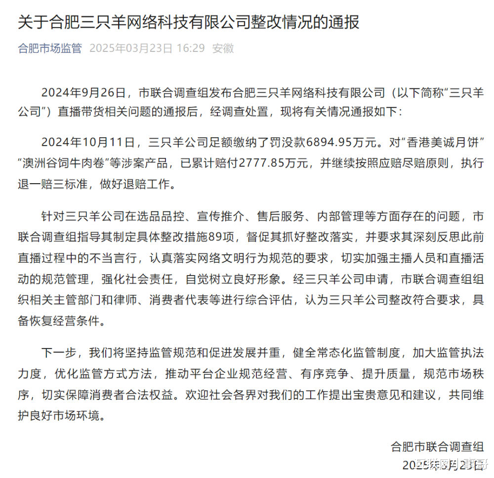可以说,这次回归是建立在此前漫长整改工作的基础上。在2025年3月发布的一份联合调查报告中显示,三只羊已于2024年10月全额支付6894.95万元罚没款,并针对问题产品如“香港美诚月饼”“澳洲谷饲牛肉卷”累计赔付2777.85万元,后续仍在推进“退一赔三”的赔偿措施。同时,为确保规范运营,他们也落实了89项整改要求,包括选品质量、宣传规范、售后服务等多个维度。