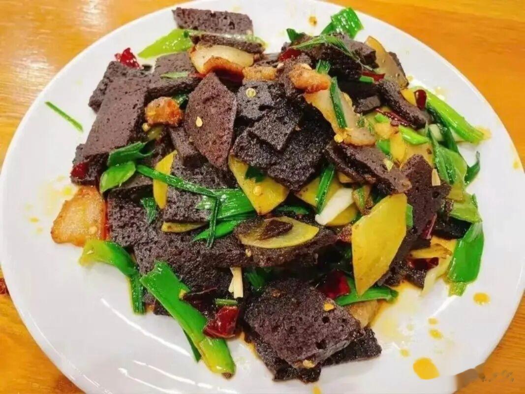 质朴咸香:粉条白菜、新鲜猪肉合炒;猪血与荞麦面或小麦黑面混合摊制后炒食;洋芋与猪油的合拍