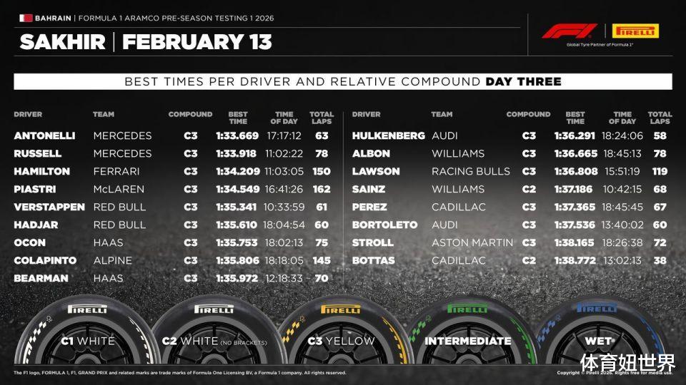 为首轮巴林季前测试做总结的第三天共有最多的17人上场,虽然其中前两天遭遇不少状况、更因此更换动力单元的梅奔车队在这天摆脱先前的不顺让两位车手都完整演练到排位赛与决赛两种模式,并以唯二达到1分33秒的圈速作结,不过除了领队沃尔夫仍不改先前说法外,拉塞尔也抱持保留态度。