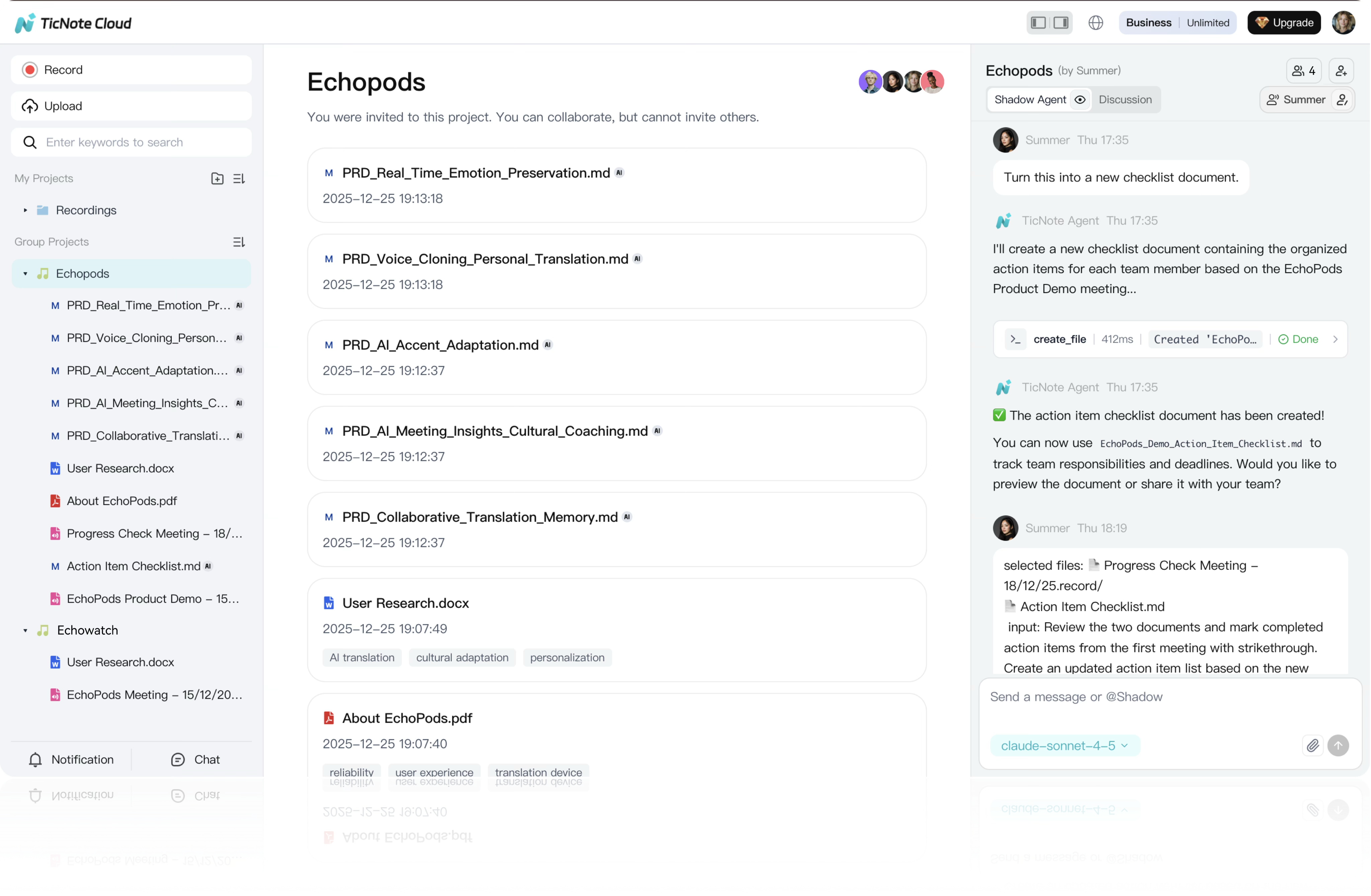 对于TicNote Cloud上创建的每一个项目,用户可以自由组建团队,进行讨论决策。Agent基于项目感知和指令,对文件进行操作,每一个想法的迸发、每一次的文件修改,都能实时同步给其他成员。
